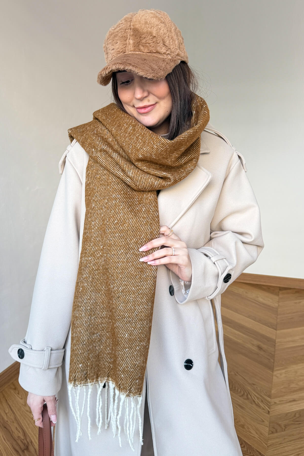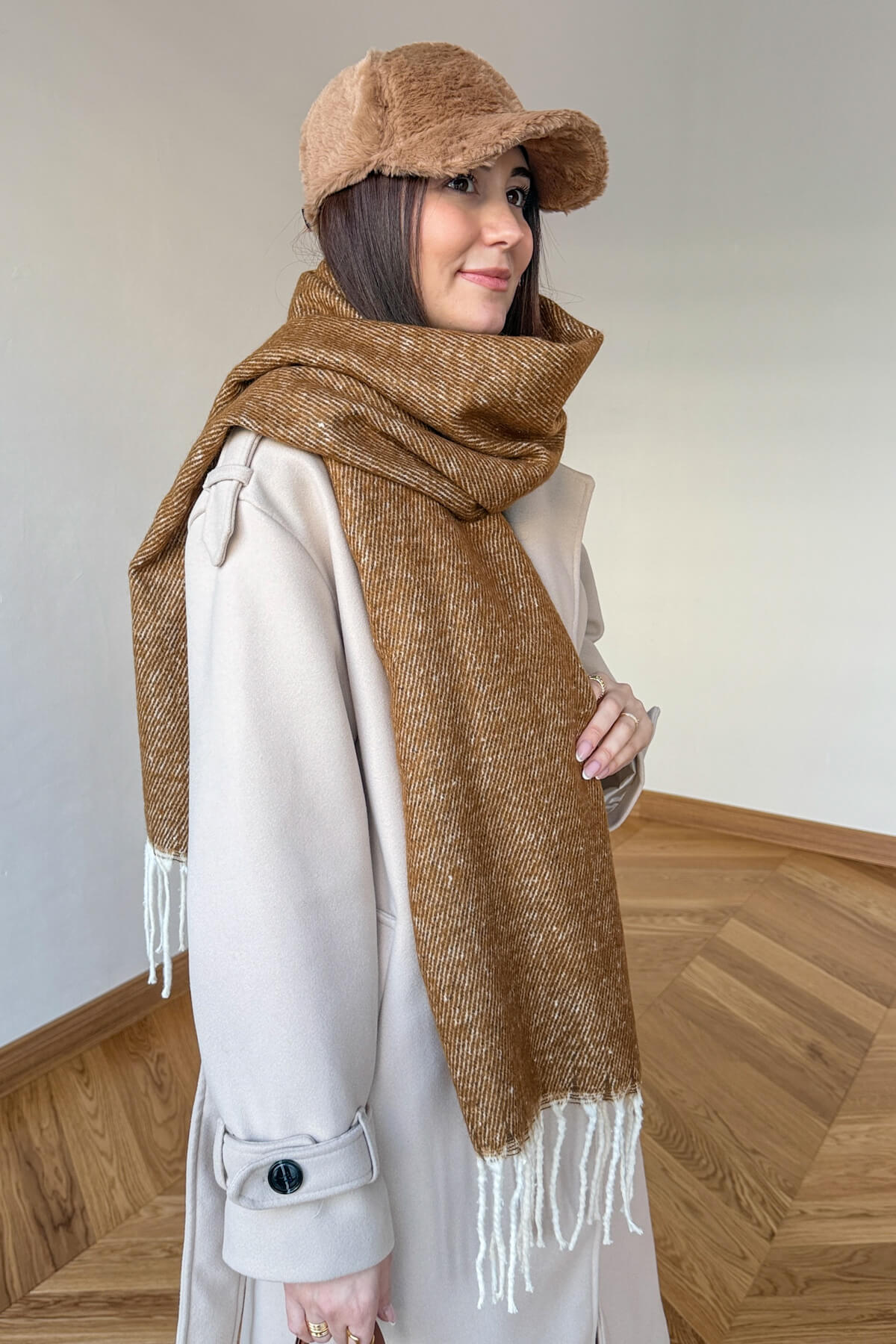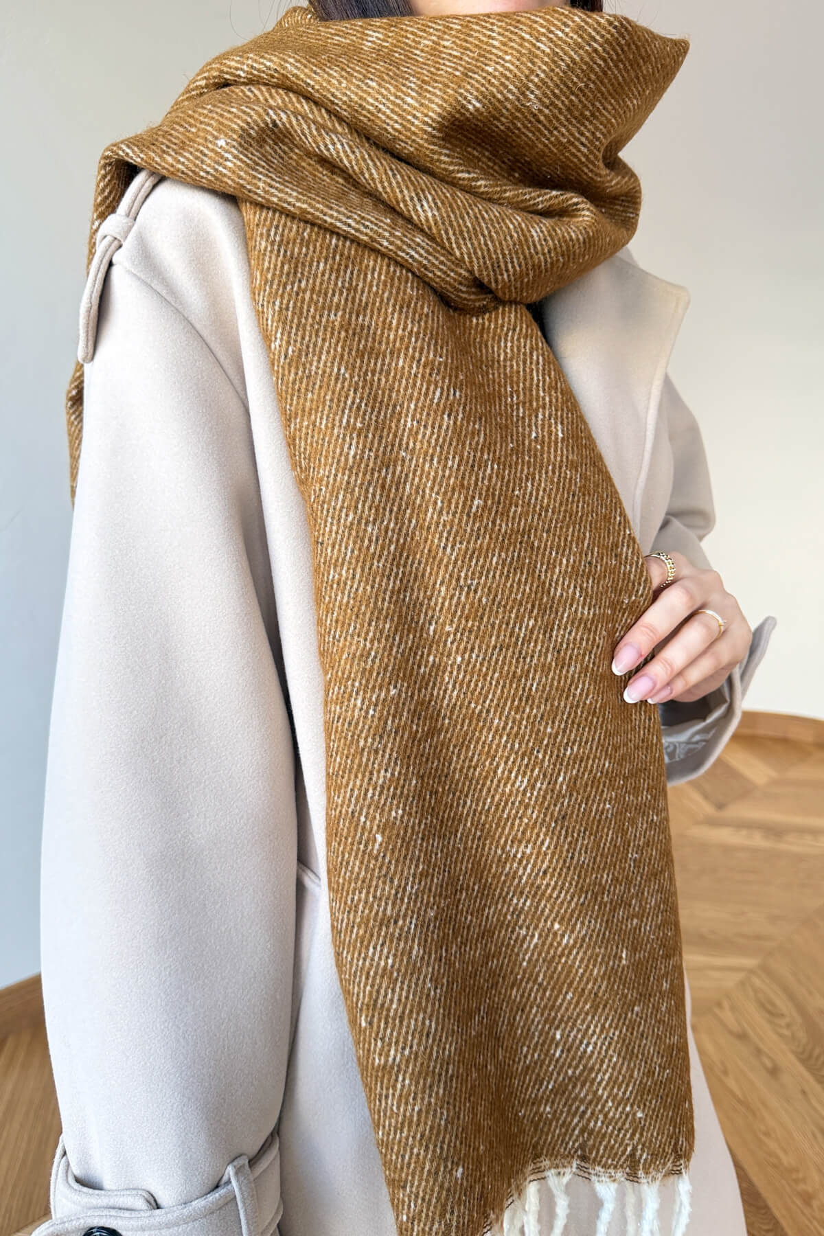 Soğuk günlerde sizi sıcak tutacak bu dokuma şal, yumuşak yüzeyi ve geniş ebatlarıyla konforlu bir kullanım sunar. Uçlarındaki püskül detayları ve modern renk tonları, kış kombinlerinize hareket katar. İdeal uzunluğu sayesinde boynunuza dilediğiniz gibi sarabilir veya omuzlarınıza alarak şal gibi kullanabilirsiniz.