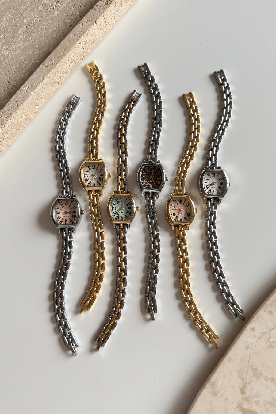 Klasik saat tasarımını modern bir mücevher zarafetiyle buluşturan April, kare kasa formu ve renkli kadranıyla zamansız bir şıklık sunuyor. Bileği nazikçe saran ince baklalı gold çelik kordonu, saati bir aksesuardan öte şık bir takıya dönüştürüyor. Günlük kullanımda stilinize sofistike bir dokunuş katarken, özel davetlerde zarif bir tamamlayıcı olan bu model, estetik ve kaliteyi bir arada arayan kadınlar için tasarlandı.