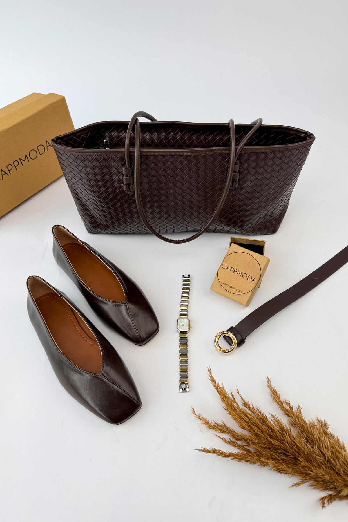 Aria Serisi, dokuların kontrast uyumunu minimalist bir zarafetle sunarak stilinizde seçkin bir imza oluşturuyor. Parlak rugan babetlerin modern küt burun formu, İtalyan esintili maksi boy örgü çantanın zamansız dokusuyla kusursuz bir denge yakalıyor. Gold halka tokalı pürüzsüz kemer bel hattınıza zarif bir vurgu yaparken, sete eşlik eden iki renkli (gold-gümüş) çelik kordonlu vintage saat, klasik duruşu modern bir lüksle taçlandırıyor. Fonksiyonelliği estetikle birleştiren bu set, gün boyu konfor ve zahmetsiz şıklık arayan kadınlar için özenle küratörlüğü yapılmış bir yatırımdır.