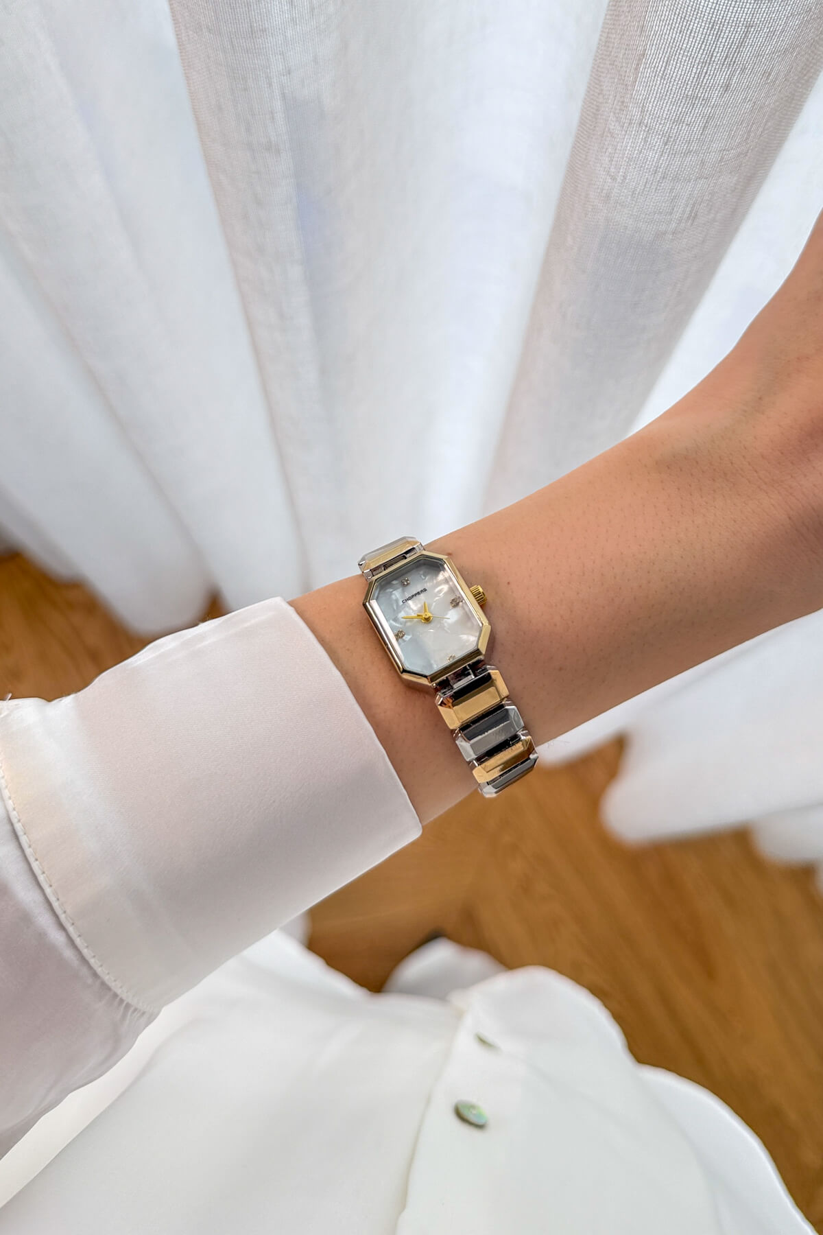 Saat: Vintage kare kadran, gold ve gümüş tonların iç içe geçtiği özel örme çelik kordon ve minimal indeksli şık iç tasarım.