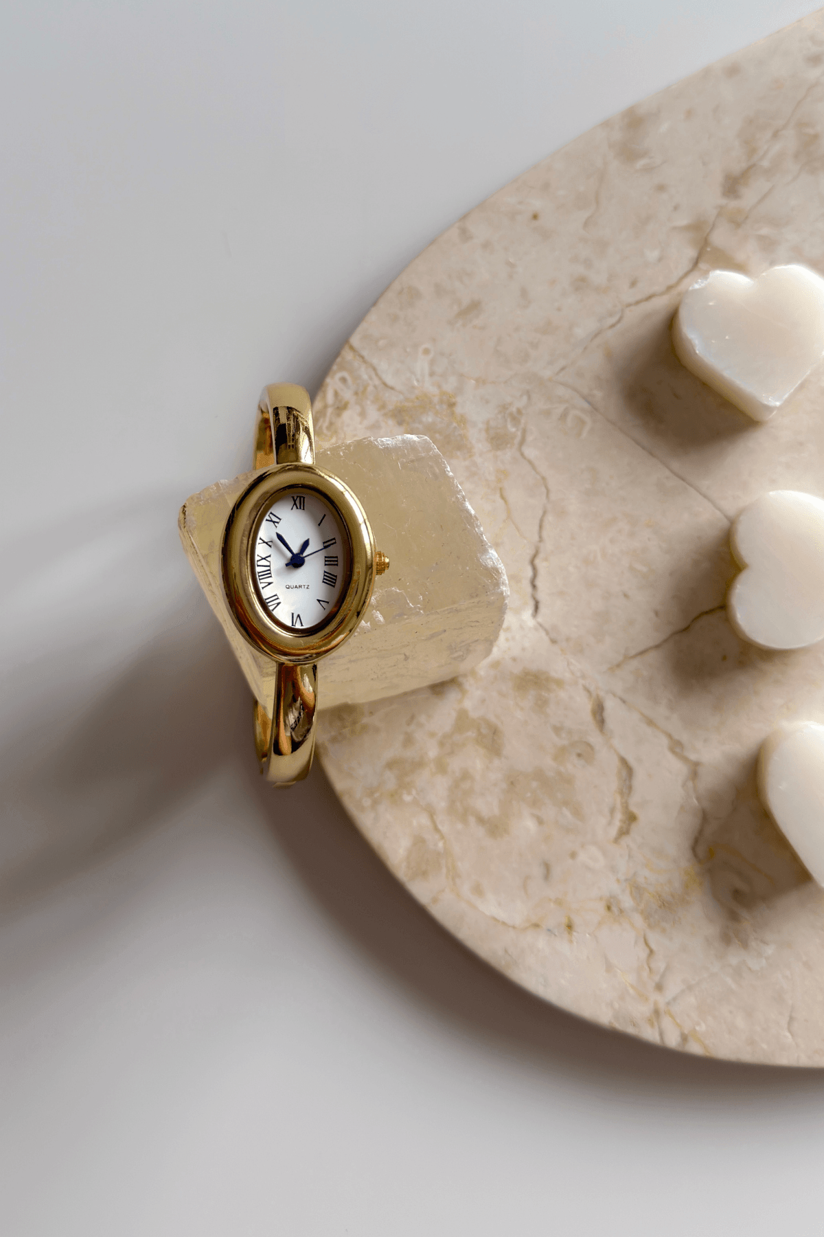 Asia, beyaz kadranın sadeliğini gold rengin ışıltılı kelepçe tasarımıyla birleştirerek bileğinizde modern bir mücevher etkisi yaratıyor. Oval kasa formu ve Roma rakamlı kadran detayıyla klasik bir duruş sergileyen bu model, ince yapısı sayesinde gün boyu konforlu bir şıklık sunar. Hem tek başına hem de favori bilekliklerinizle kombinleyebileceğiniz bu özel parça, stilinize sofistike bir dokunuş katmak için tasarlandı.