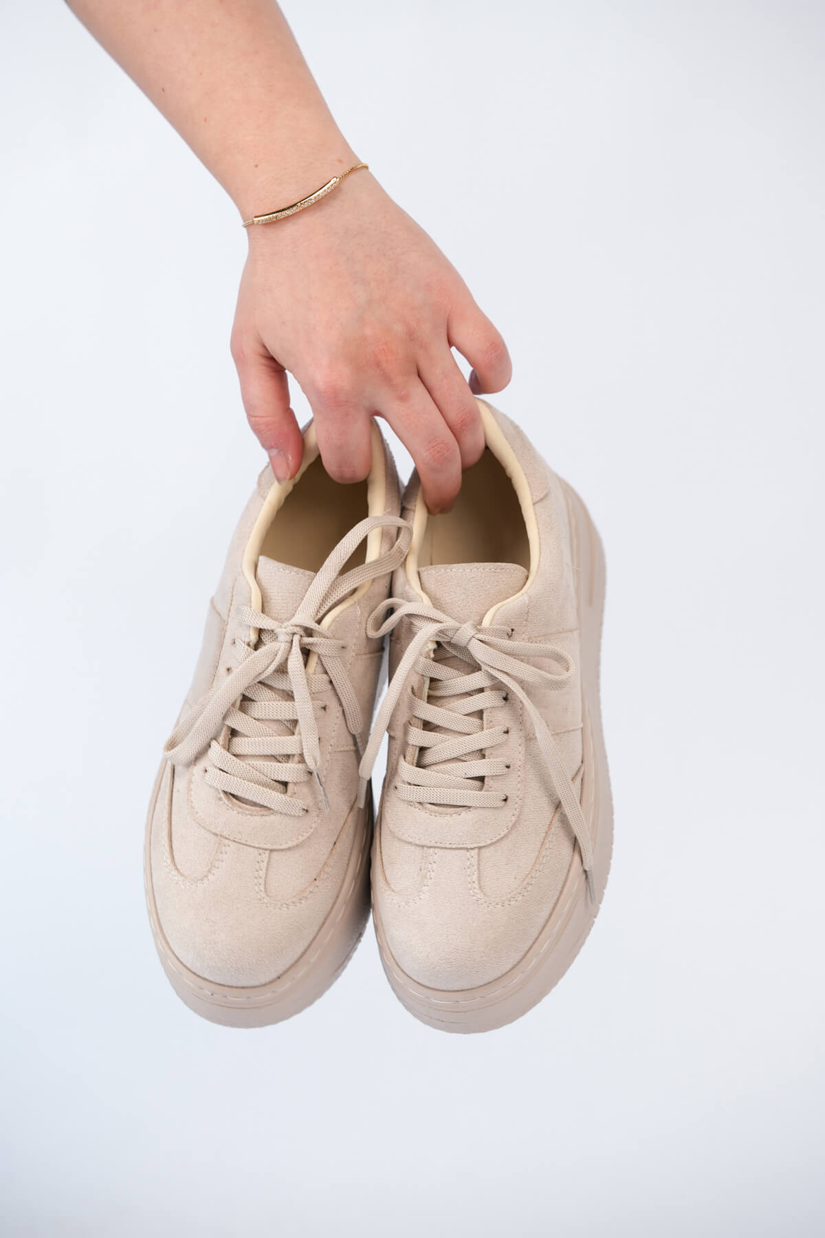 Modern silüeti ve iddialı platform tabanıyla dikkat çeken bu sneaker, konforu boy avantajıyla birleştiriyor. Tamamı süet görünümlü yumuşak dokusu, üzerinde yer alan zarif dikiş detaylarıyla zengin bir derinlik kazanıyor. Hem minimal hem de güçlü bir duruş sergileyen bu model, hafif taban yapısı sayesinde gün boyu süren bir rahatlık ve kusursuz bir silüet vaat ediyor.
