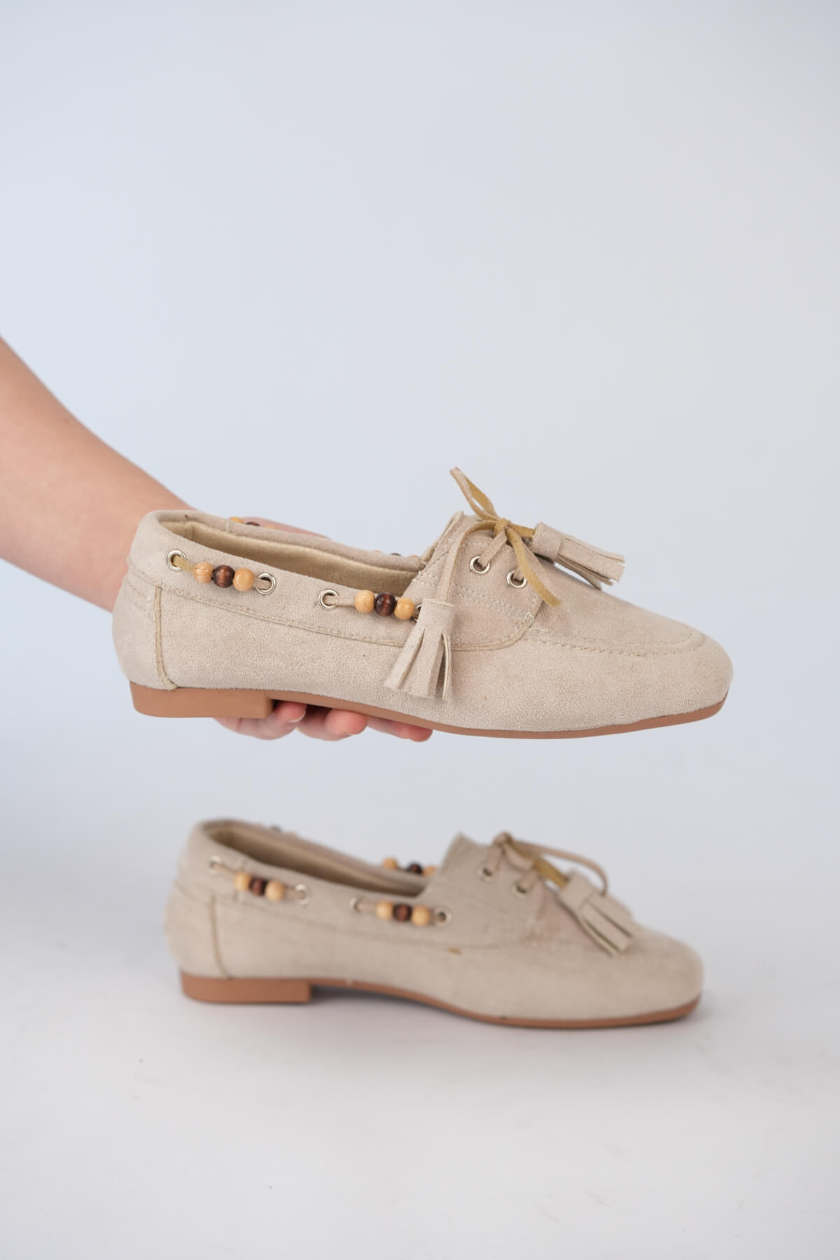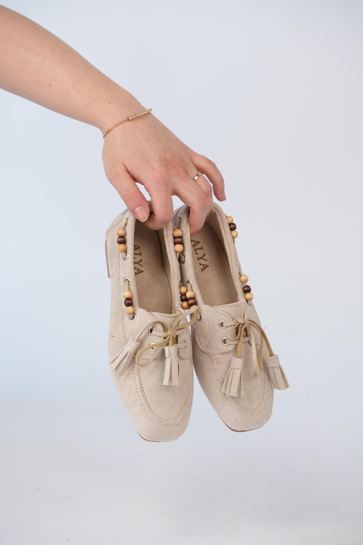 Bohem stilin özgür ruhunu modern bir şehirli tasarımıyla buluşturan bu loafer, süet dokusunun zarafetini el işçiliği hissi veren detaylarla harmanlıyor. Yan kısımlarında yer alan doğal tonlardaki boncuk işlemeleri ve ön bölümdeki hareketli püskül detayı, ayakkabıya karakteristik bir kimlik kazandırıyor. Yumuşak yapısı ve düz tabanıyla konforu odağına alan bu tasarım, gün boyu süren şıklığı ve rahatlığı bir arada arayan kadınlar için kusursuz bir tercih.