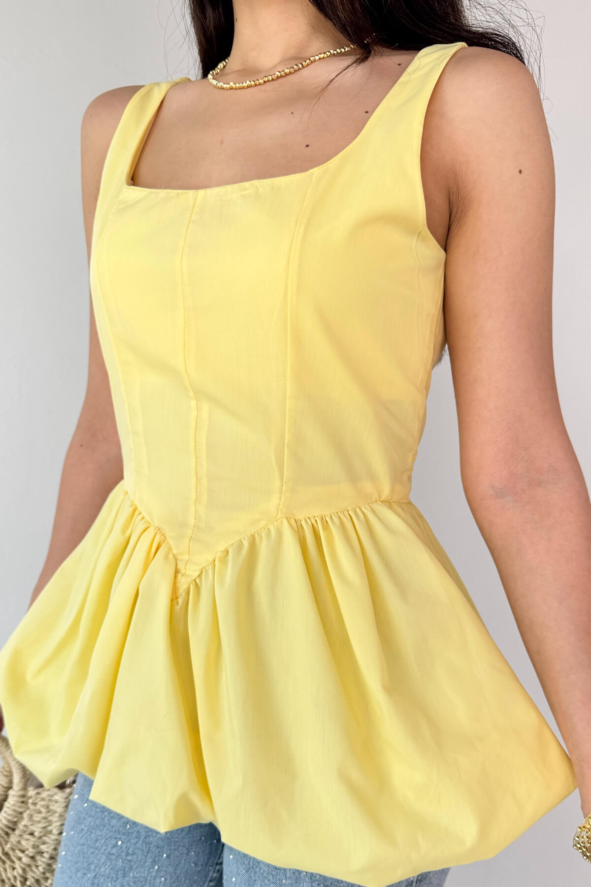 Bluz askılı, balon modeldir. Arkasında fermuar bulunur. Astarlıdır.