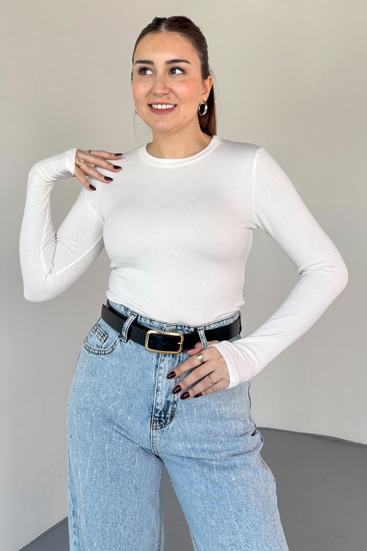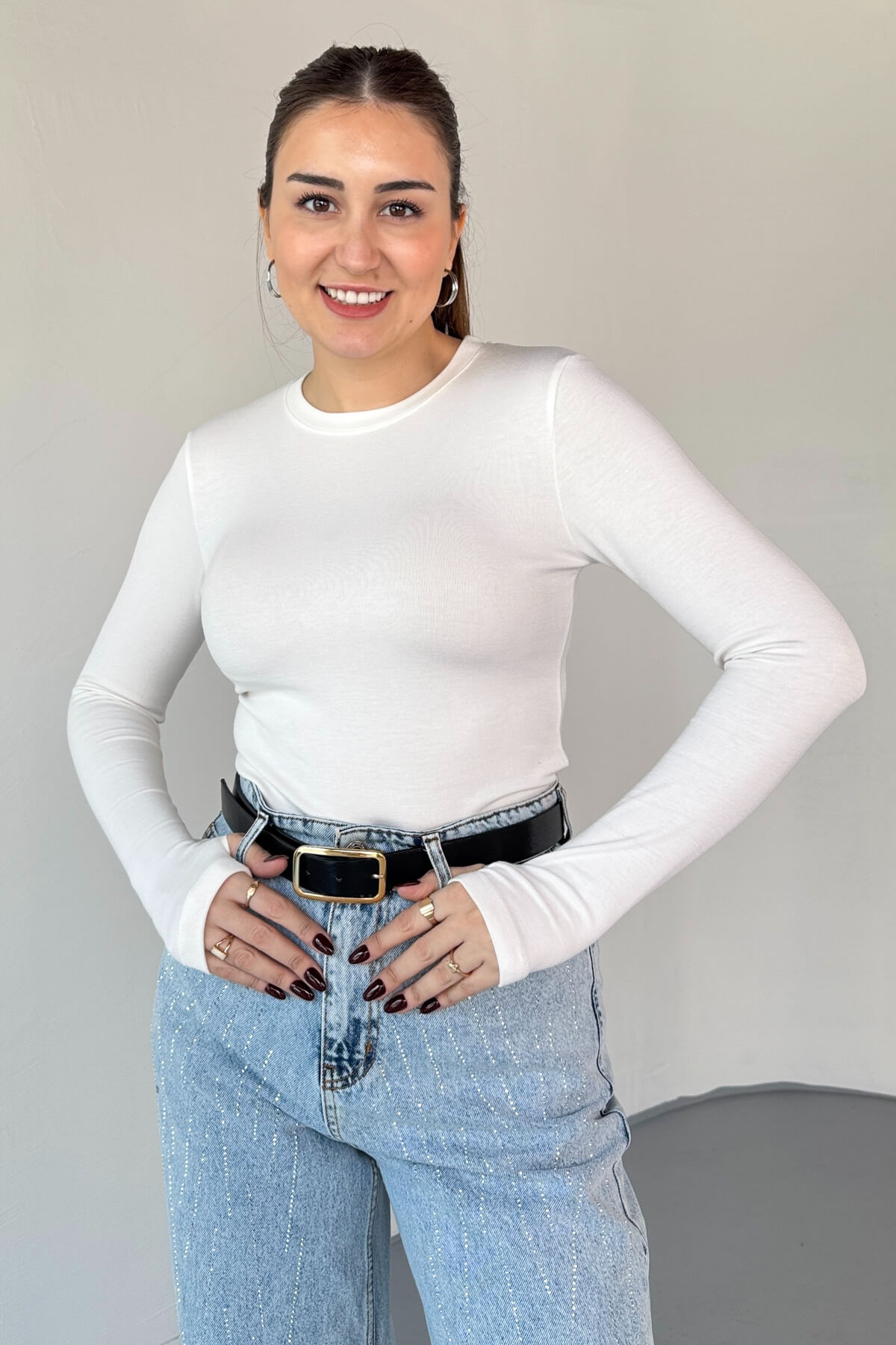 Parmak geçirmeli uzun kol detayı, modern ve spor bir stil kazandırır.