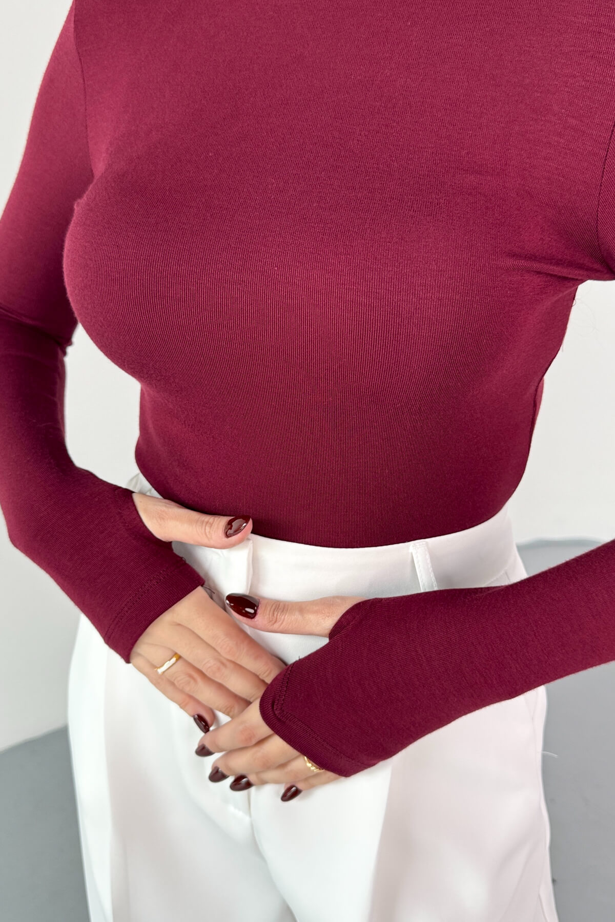 Parmak geçirmeli uzun kol detayı, modern ve spor bir stil kazandırır.