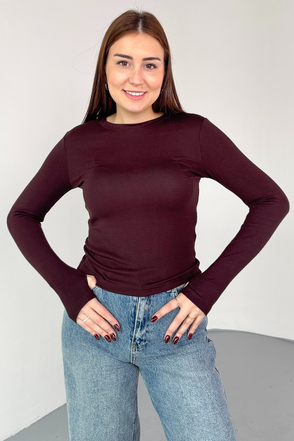 Parmak geçirmeli uzun kol detayı, modern ve spor bir stil kazandırır.