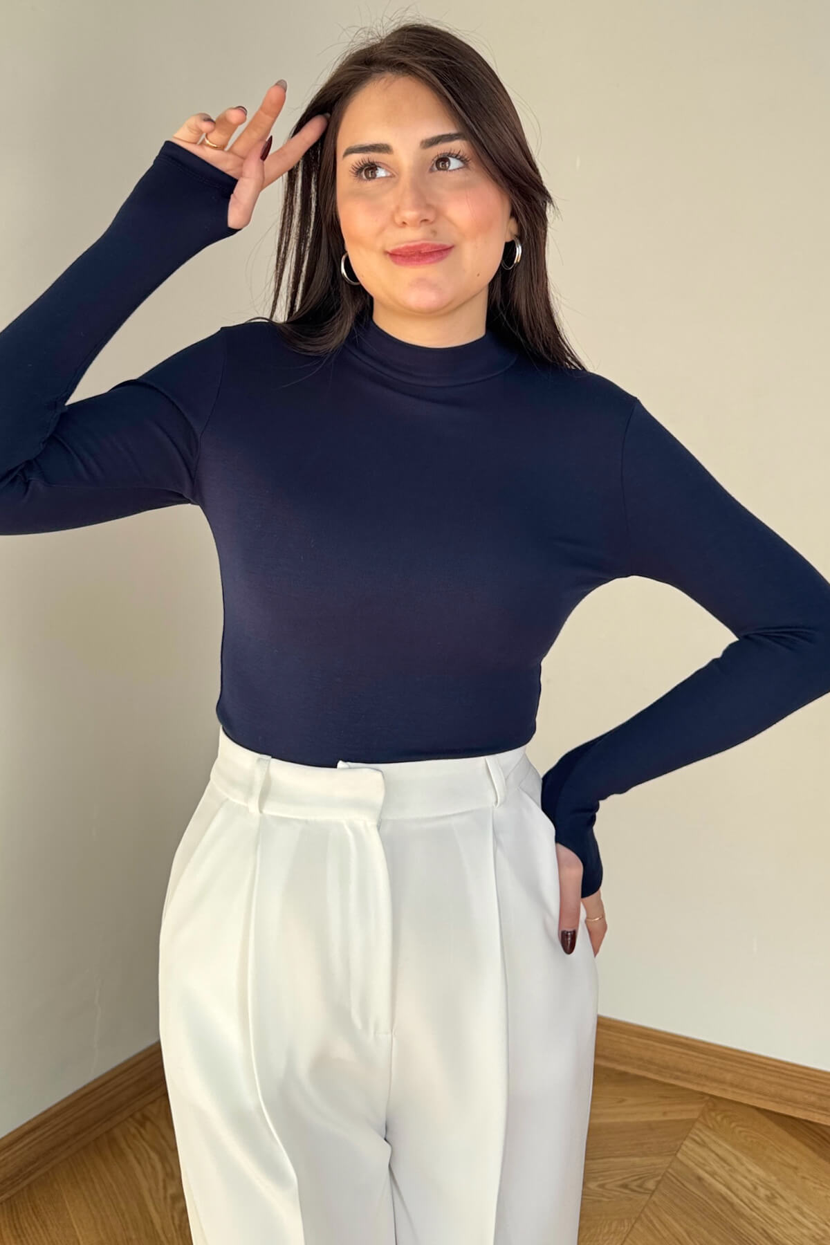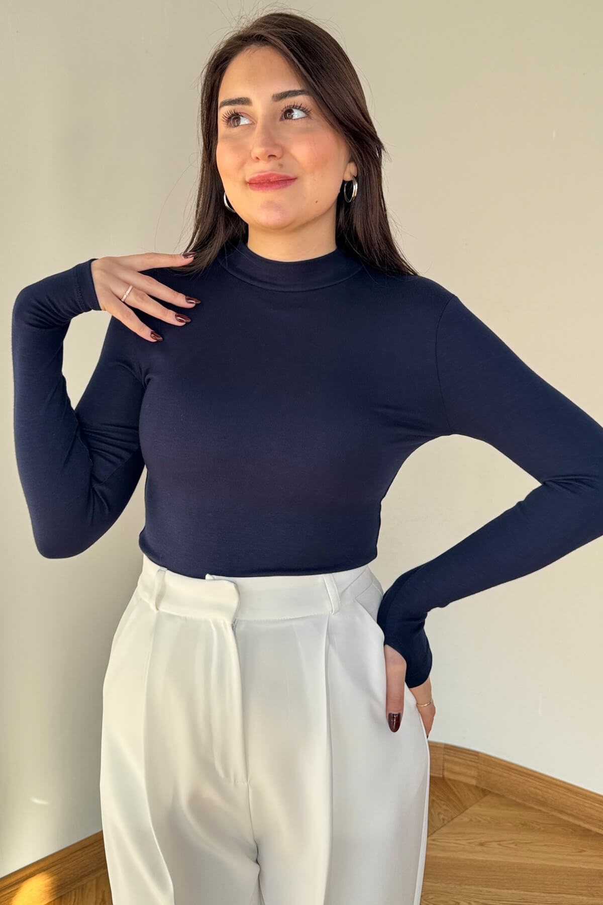 BLZ-06290 Lacivert Dik Yaka Parmak Geçirmeli Merserize Likralı Pamuklu Basic Bluz