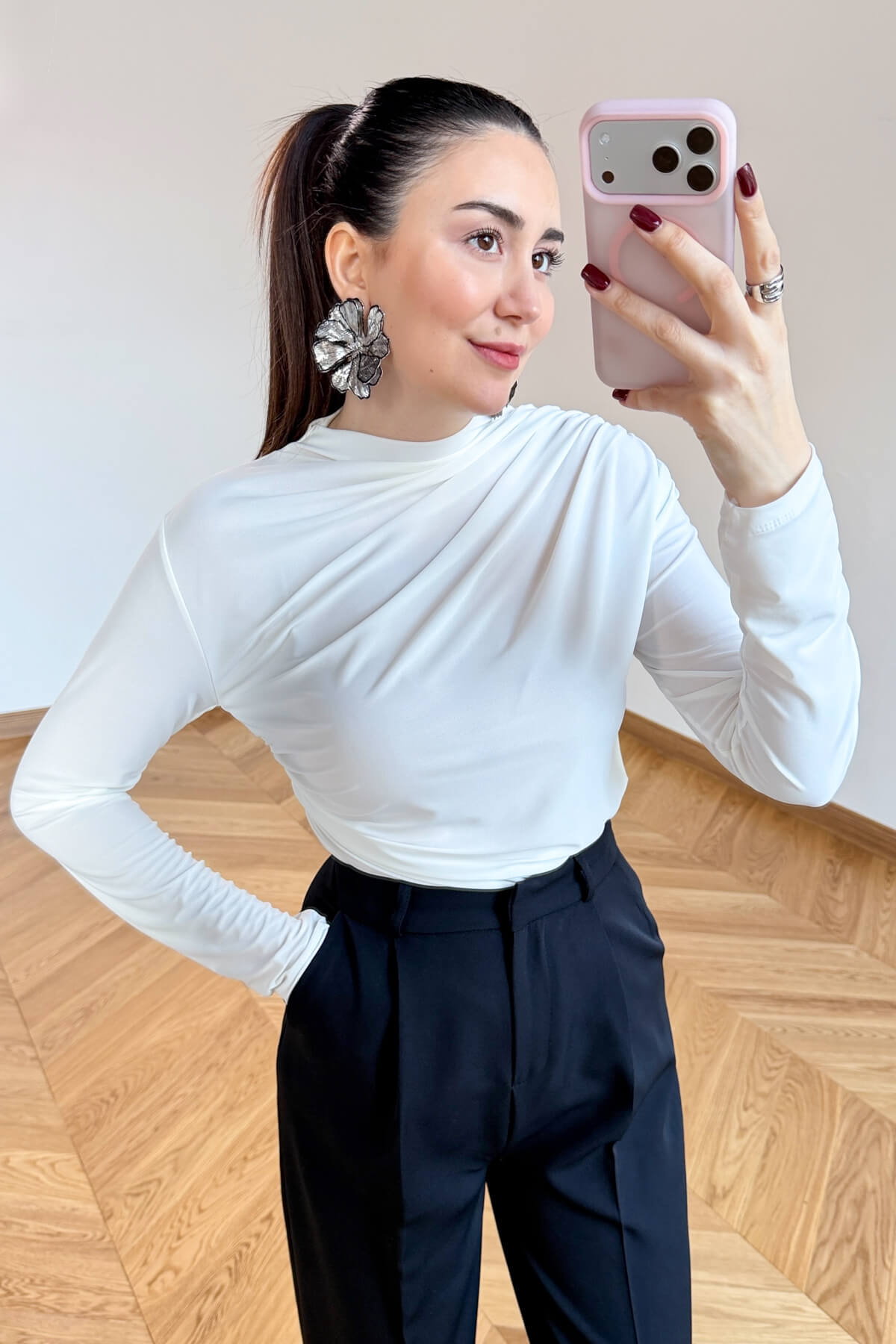 Sandy kumaşın teninizde bıraktığı ipeksi ve serin hissi, modern drapeli tasarım ile buluşturan bu bluz, gardırobunuzun en işlevsel parçalarından biri olacak. Ön kısımdaki yoğun büzgü detayları, hem kusursuz bir silüet yaratıyor hem de kumaşın akışkanlığını ön plana çıkarıyor. Siyah, ekru, kahve ve gri gibi zamansız renk seçenekleriyle sunulan bu tasarım; ister ofis şıklığında ister akşam davetlerinde konforlu bir zarafet arayanlar için ideal. Ütü gerektirmeyen yapısıyla pratik bir kullanım sunar.