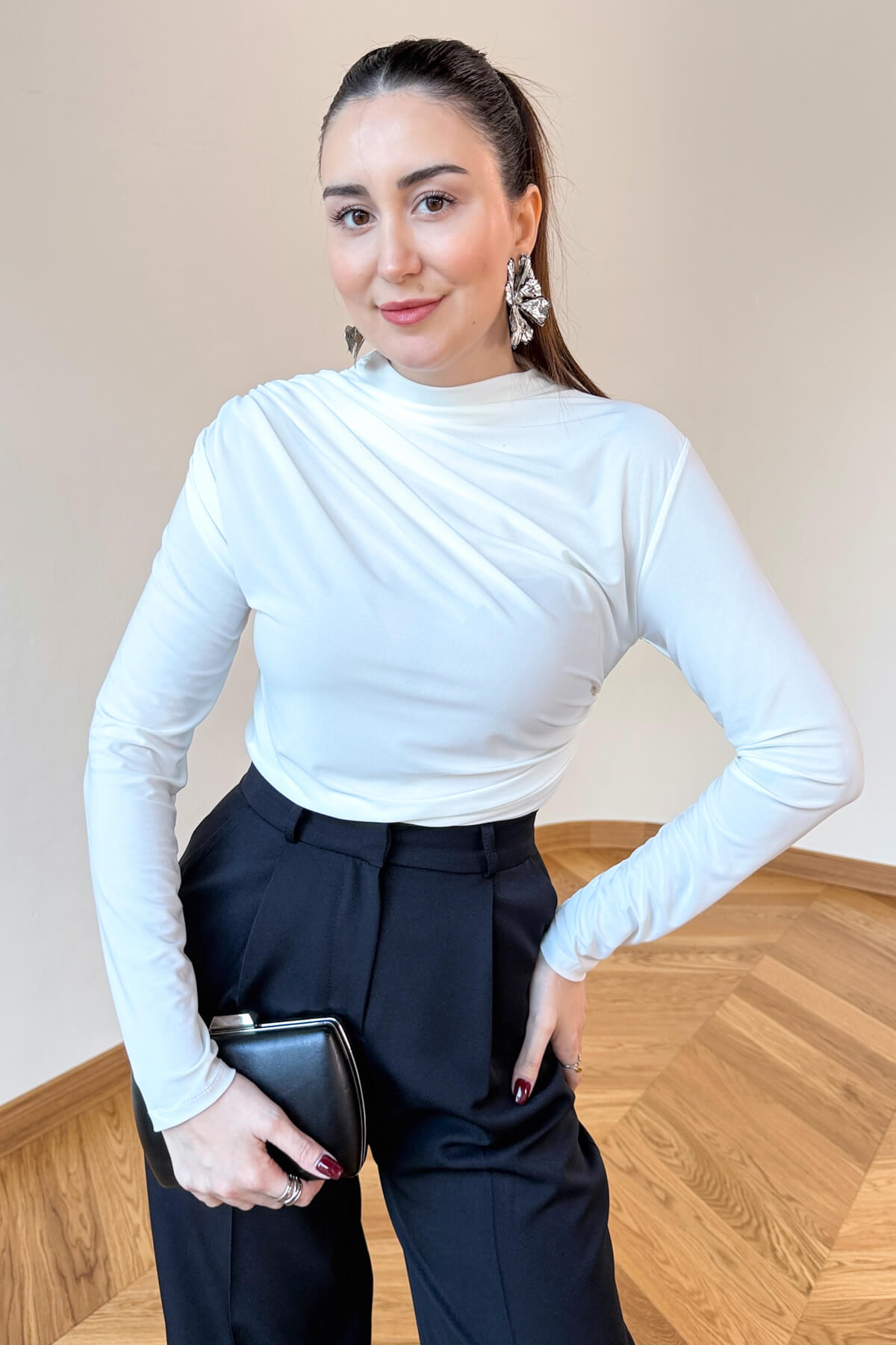Tasarım Detayı: Ön bedeni tamamen saran şık drape (büzgü) detayı