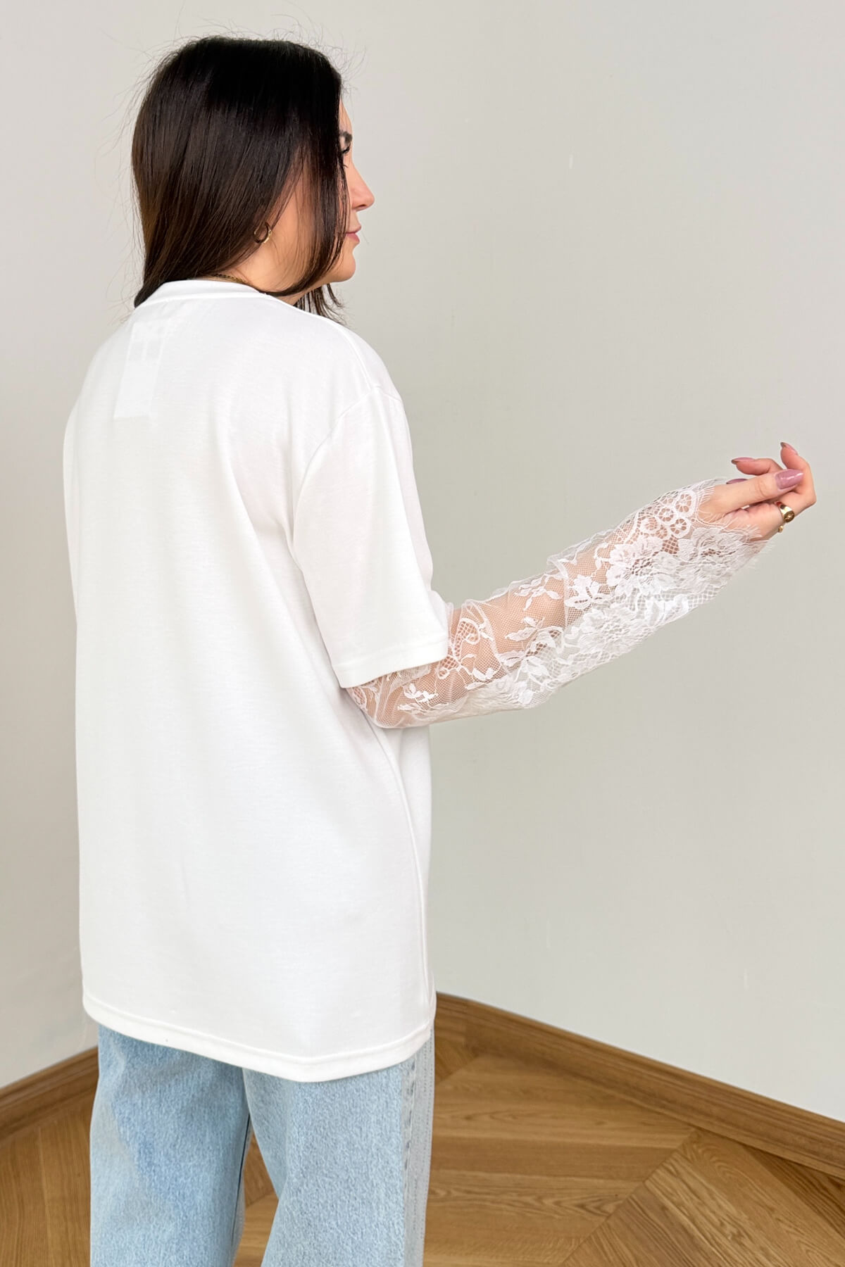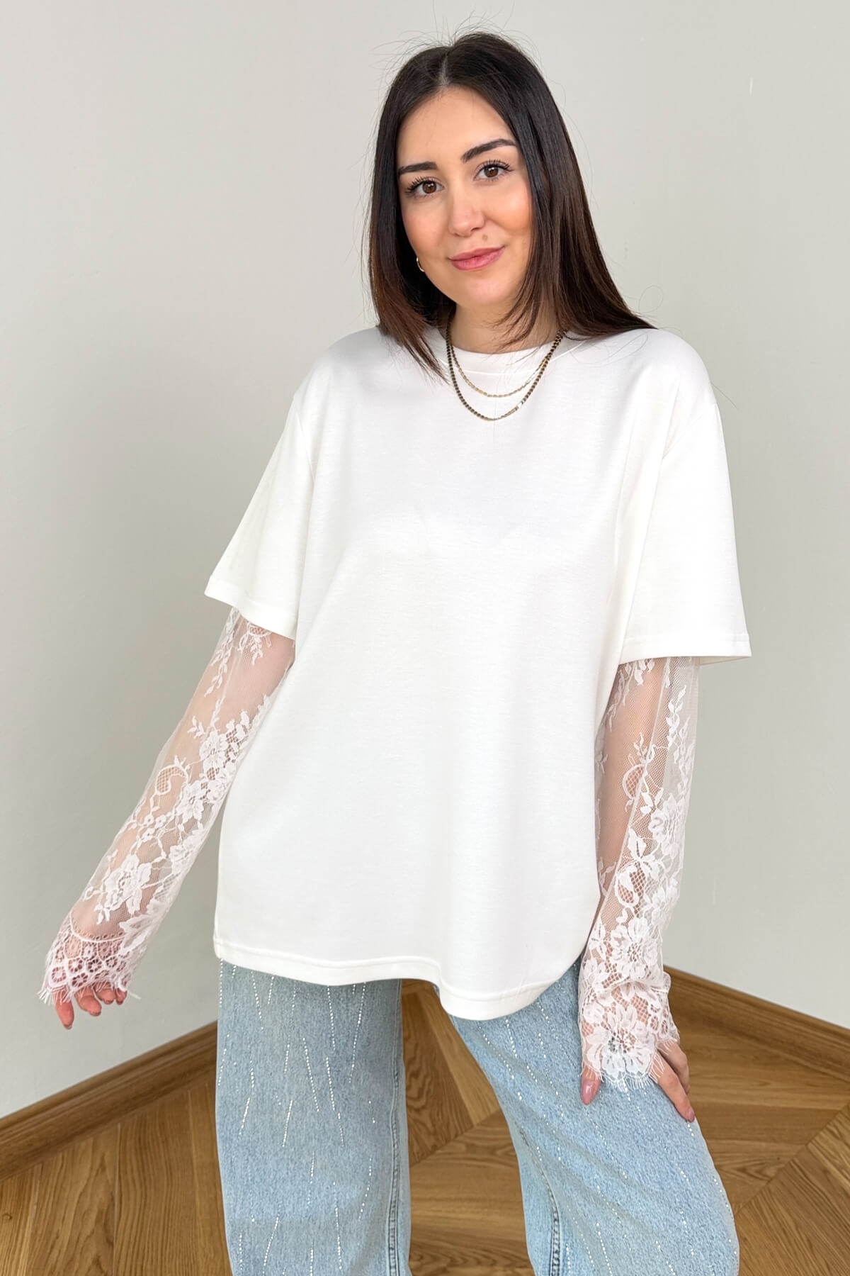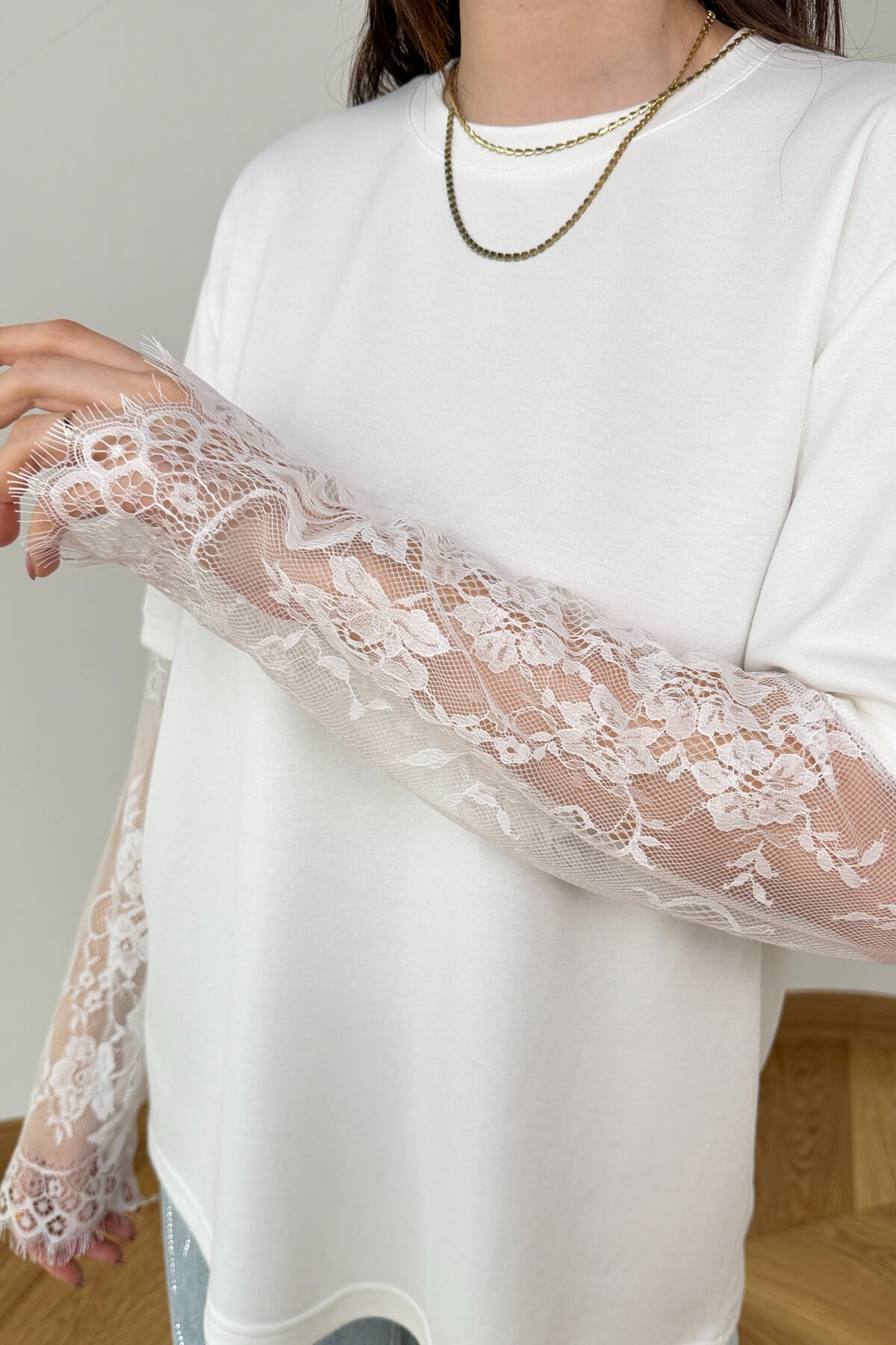 Tasarım Detayı: Kollarda yer alan geniş ve zarif dantel işlemeli garniler ile minimalist yuvarlak yaka.