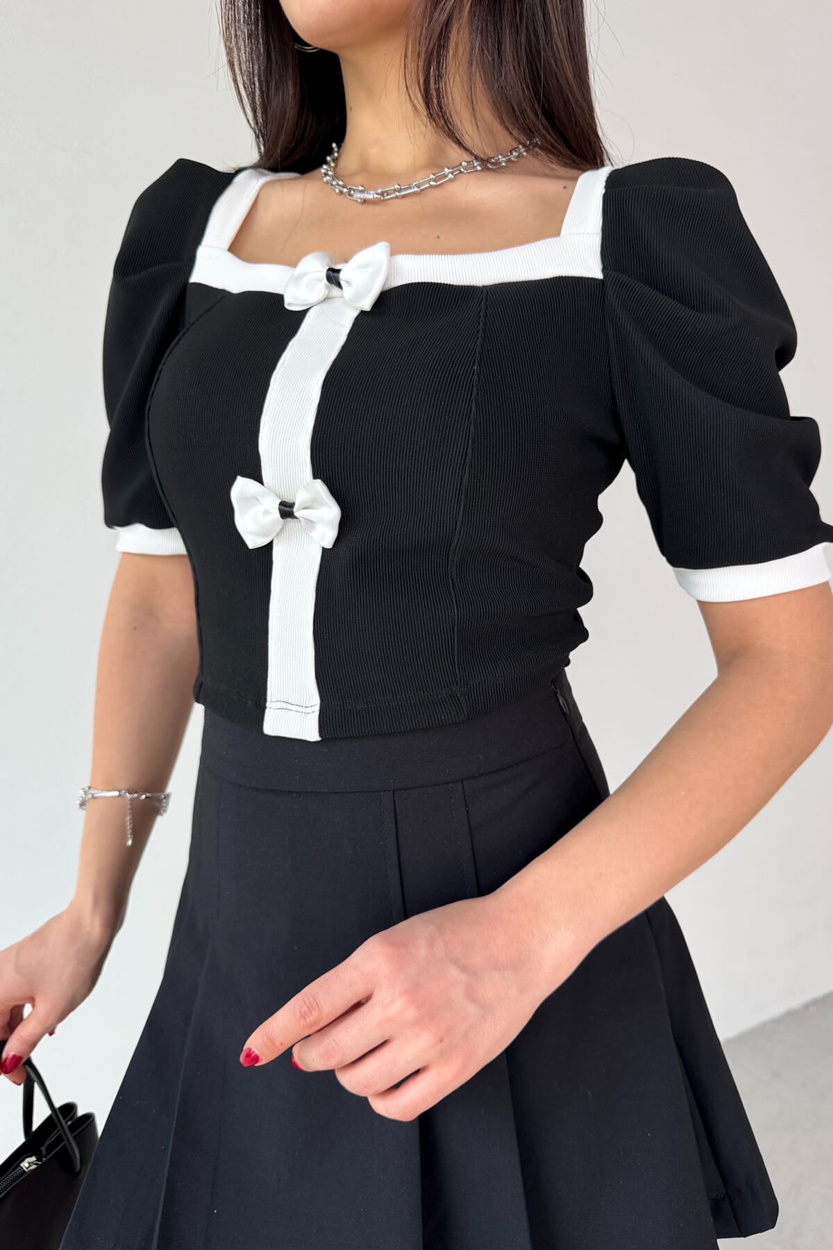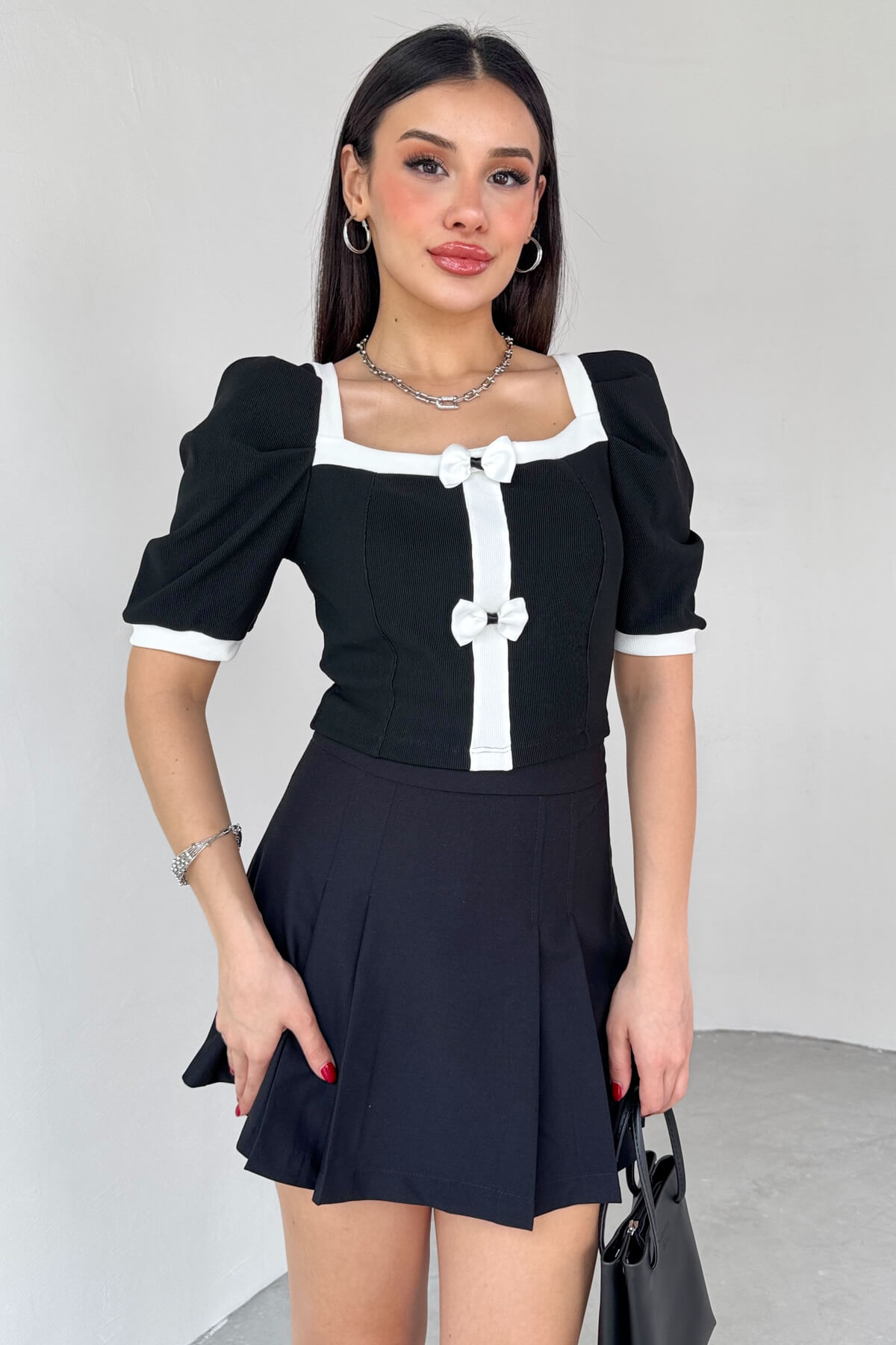 Bluz kare yaka olup, balon kol modeldir. Ön tarafında fiyonk düğme, arka tarafında bağlama detayı bulunur.