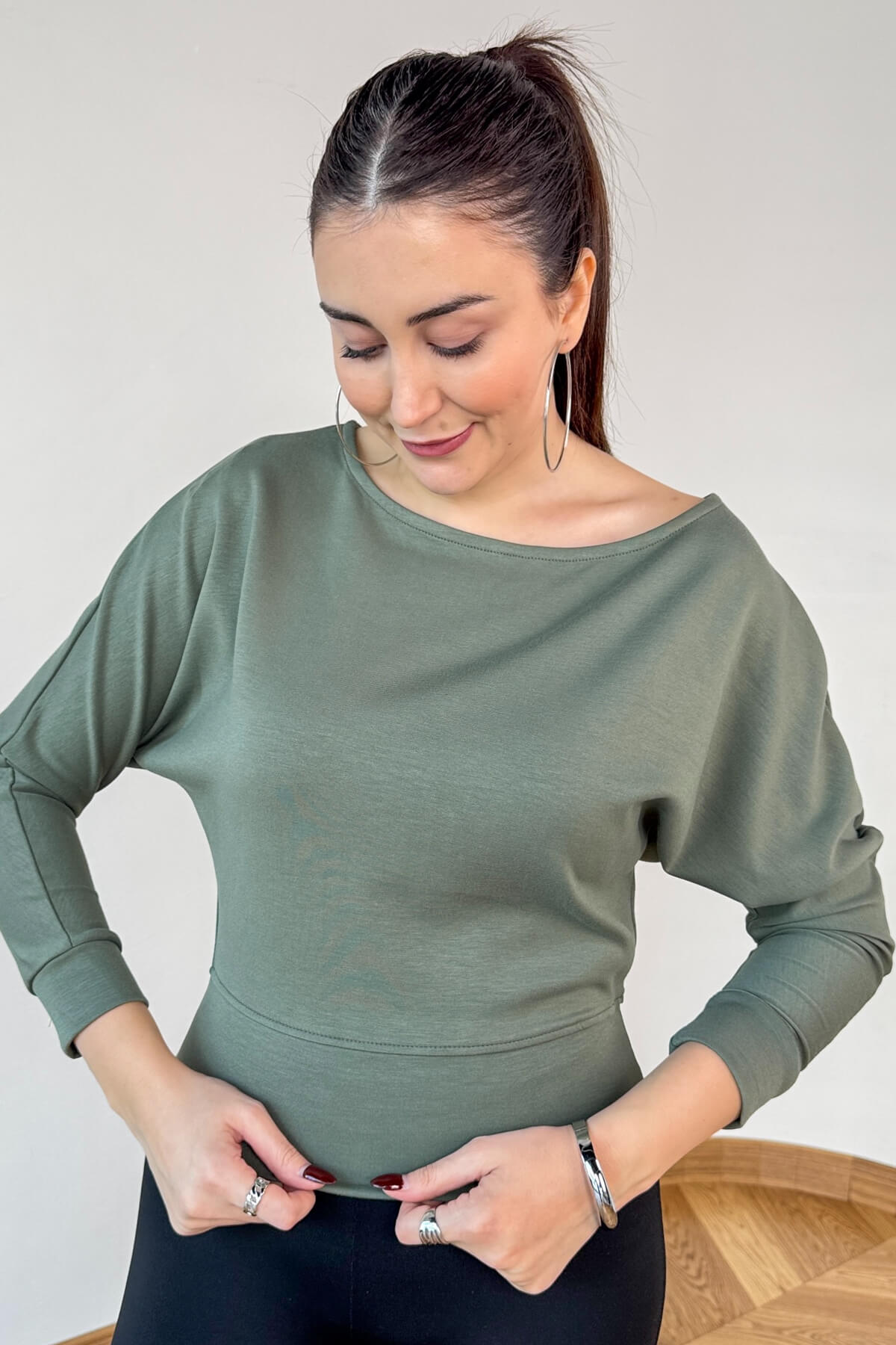 BLZ-5319 Haki Bel Lastikli Kayık Yaka Basic Fit Bluz
