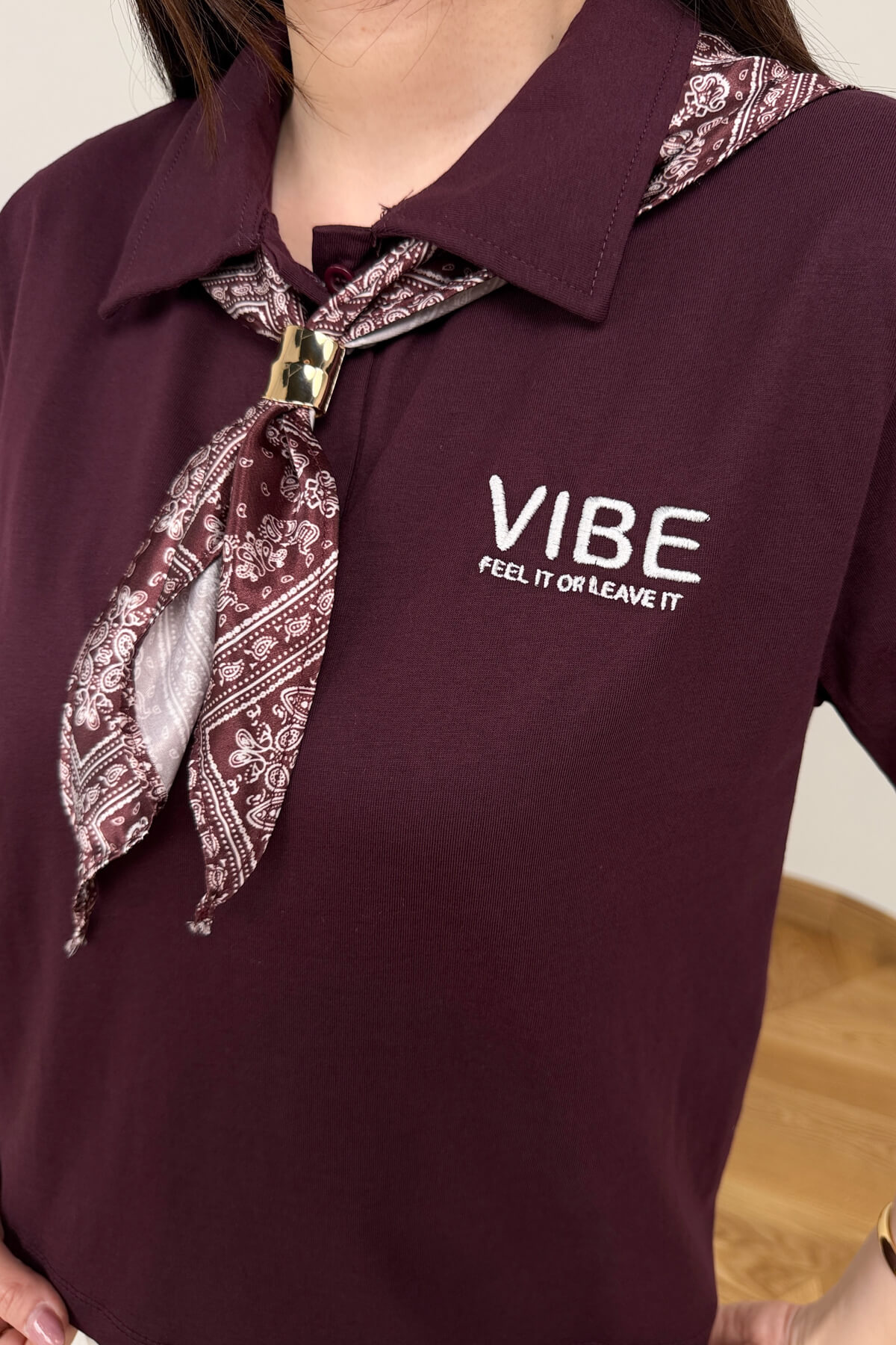 Sportif polo yaka formunu zarif bir fular detayıyla buluşturan bu bluz, günlük stilinize modern ve sofistike bir dokunuş katıyor. Yumuşak dokulu pamuklu kumaşı sayesinde gün boyu nefes alan ve konforlu bir kullanım sunan tasarım, 55 cm boyu ile yüksek bel alt gruplarıyla mükemmel bir uyum yakalıyor. Boyun kısmındaki desenli fular ve şık metal toka detayı, en sade kombinleri bile anında hareketlendirerek çabasız bir zarafet sergilemenizi sağlıyor.