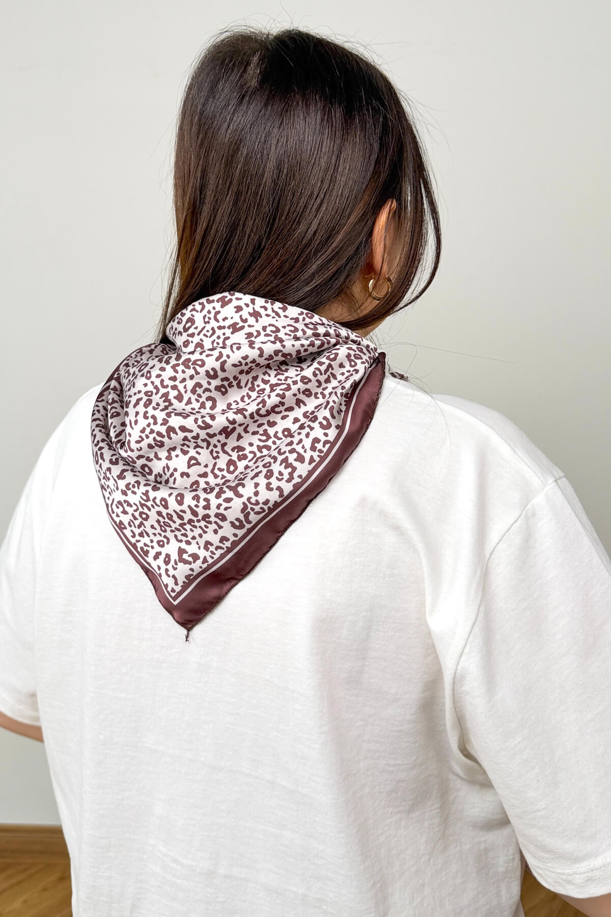 Tasarım Detayı: Yakada sabitlenen, metal tokalı ve leopar desenli şık fular aksesuarı.