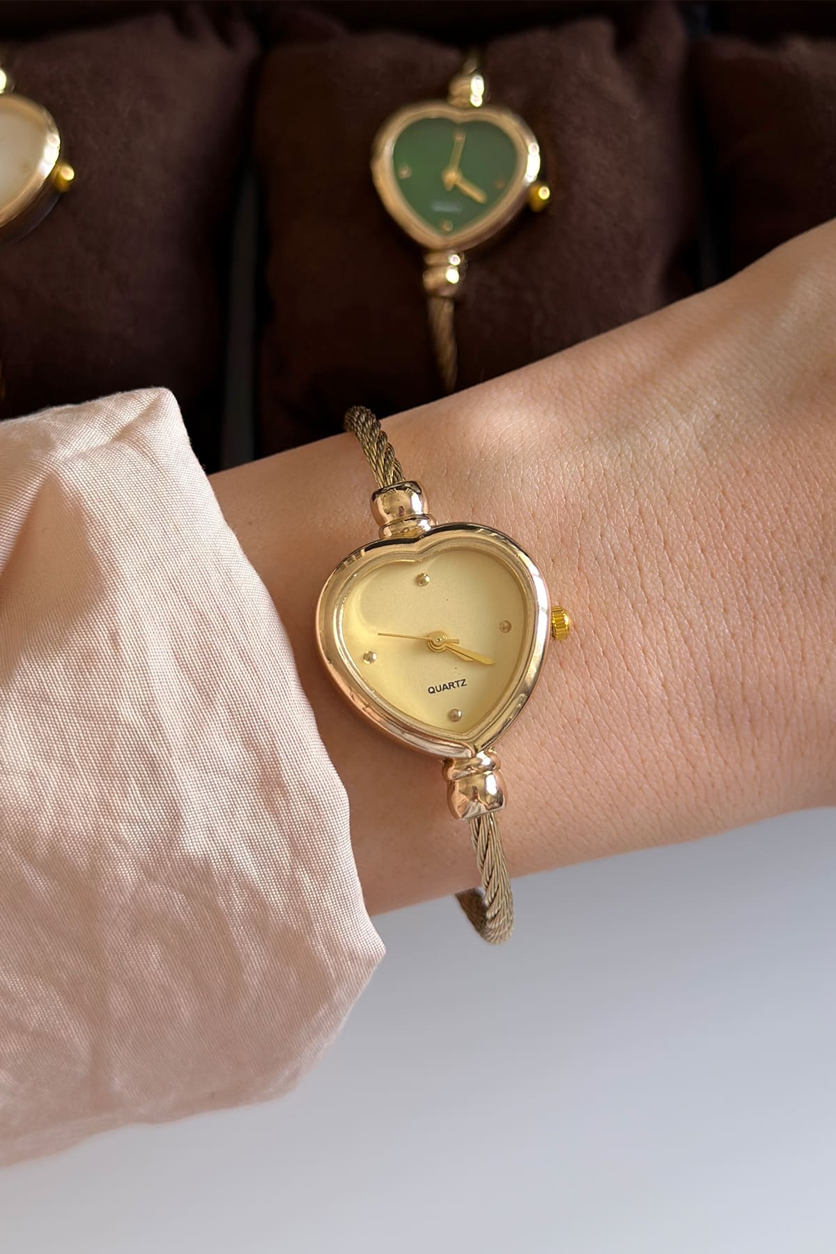 Aşkın en zarif halini bileğinizde taşıyın; Romantik kalp formu ve ince hasır kordonuyla zarafeti yeniden tanımlıyor. Modern kadının romantik ruhunu yansıtan bu özel tasarım, minimal kadranı ve gold ışıltısıyla hem günlük stilinize hem de en özel anlarınıza eşsiz bir dokunuş katıyor. Paslanmaz çelik yapısı ve yüksek kaliteli kaplaması sayesinde ilk günkü parlaklığını koruyan bu saat, kendinizi veya sevdiklerinizi şımartmak için kusursuz bir tercih.