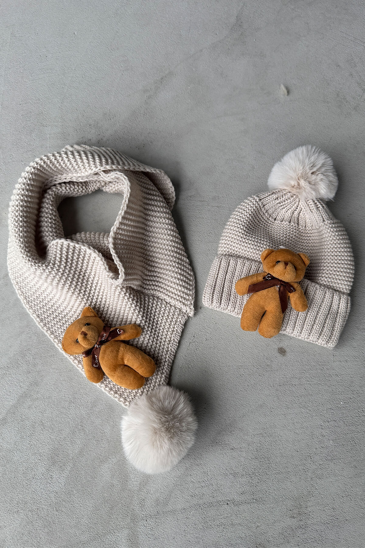 ÇCK-9002 Taş Rengi Ayıcık Detaylı Örme Şal Bere Takımı