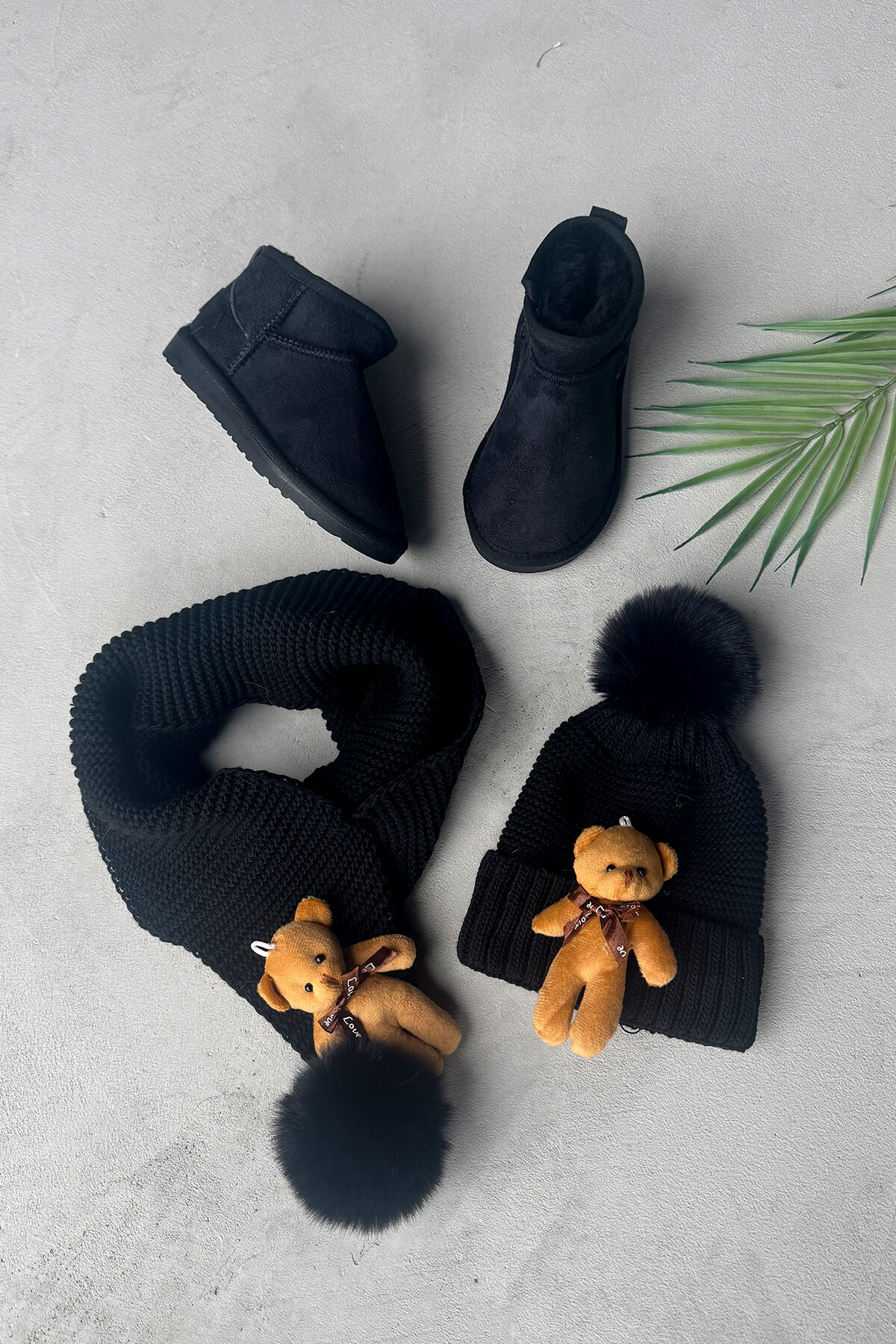 ÇCK KMBN-1 Siyah Ayıcık Detaylı Örme Ponponlu Şal ve Bere İçi Kürklü Yumuşak Taban Bot Üçlü Kombin