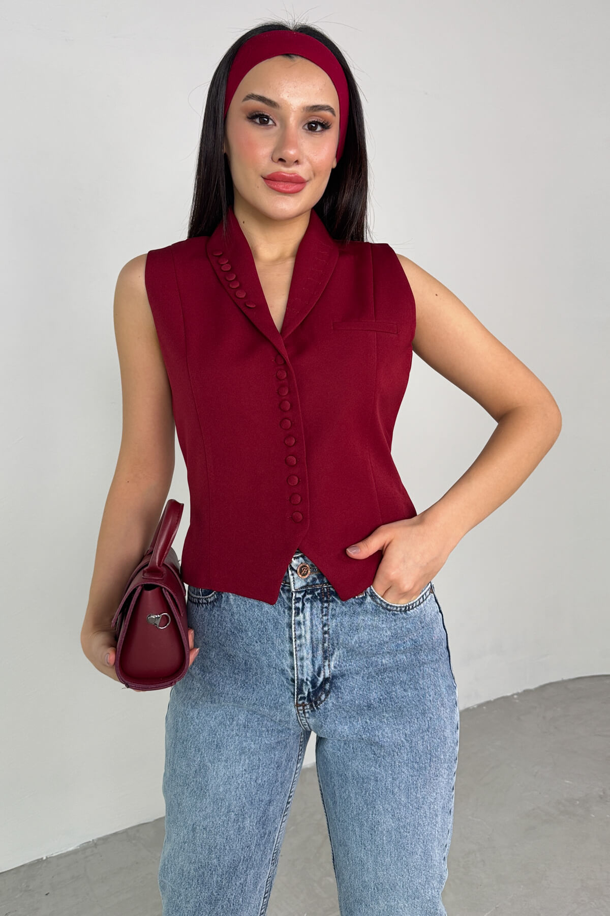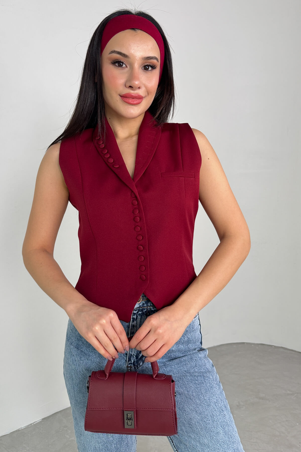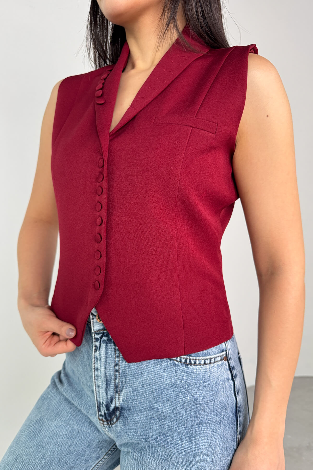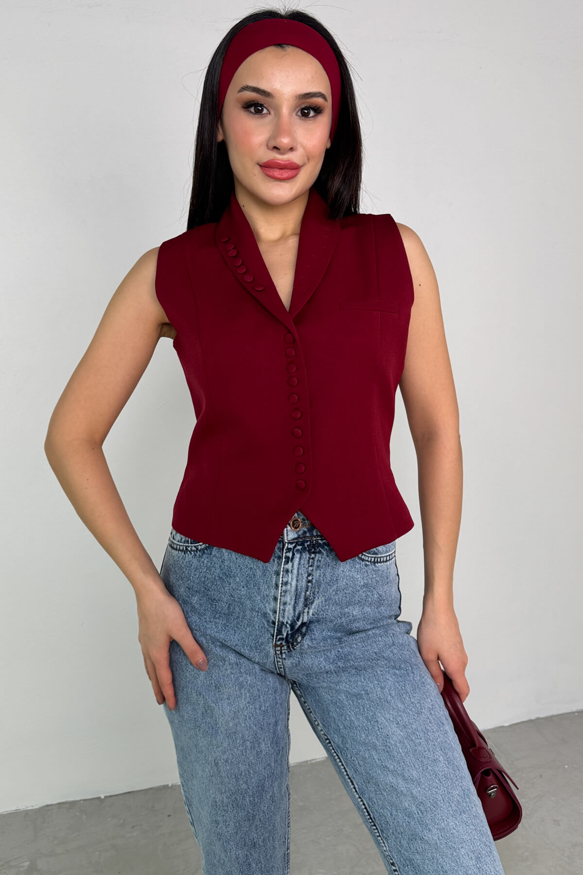 CKT-12442 Bordo Düğme Detay Kruvaze Yaka Astarlı Yelek
