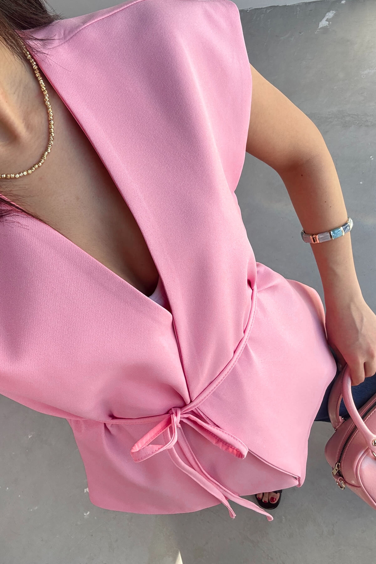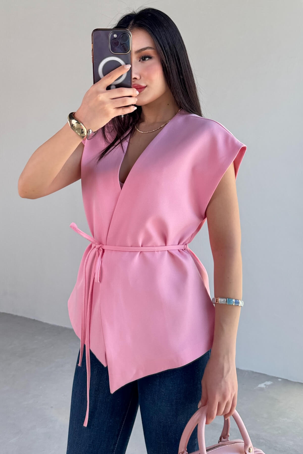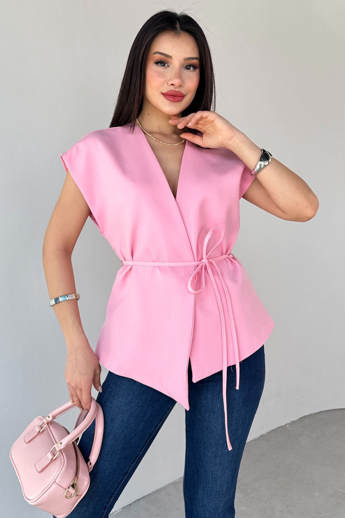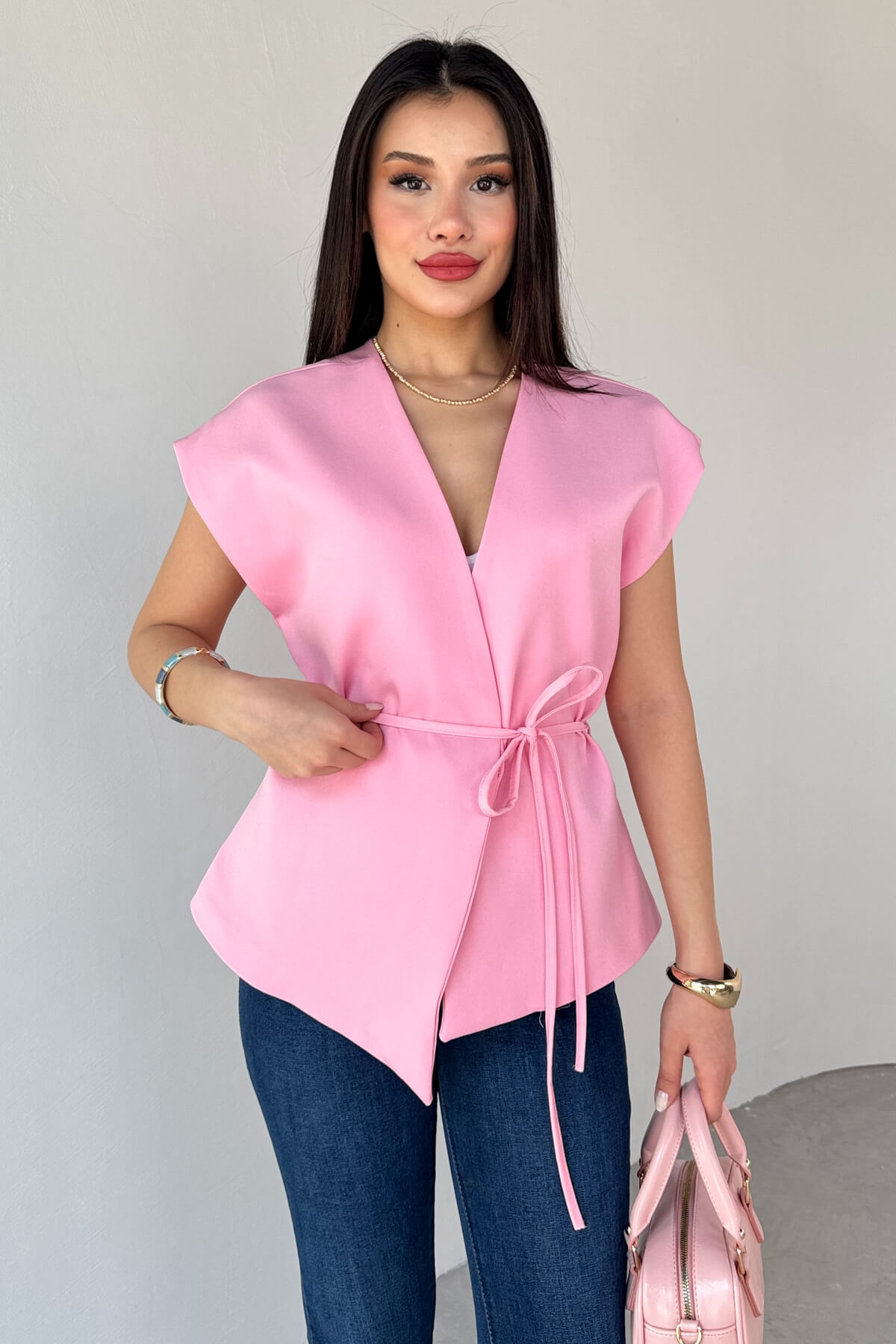 Yelek bağlama detayına sahip, astarlı ve gizli düğmelidir.
