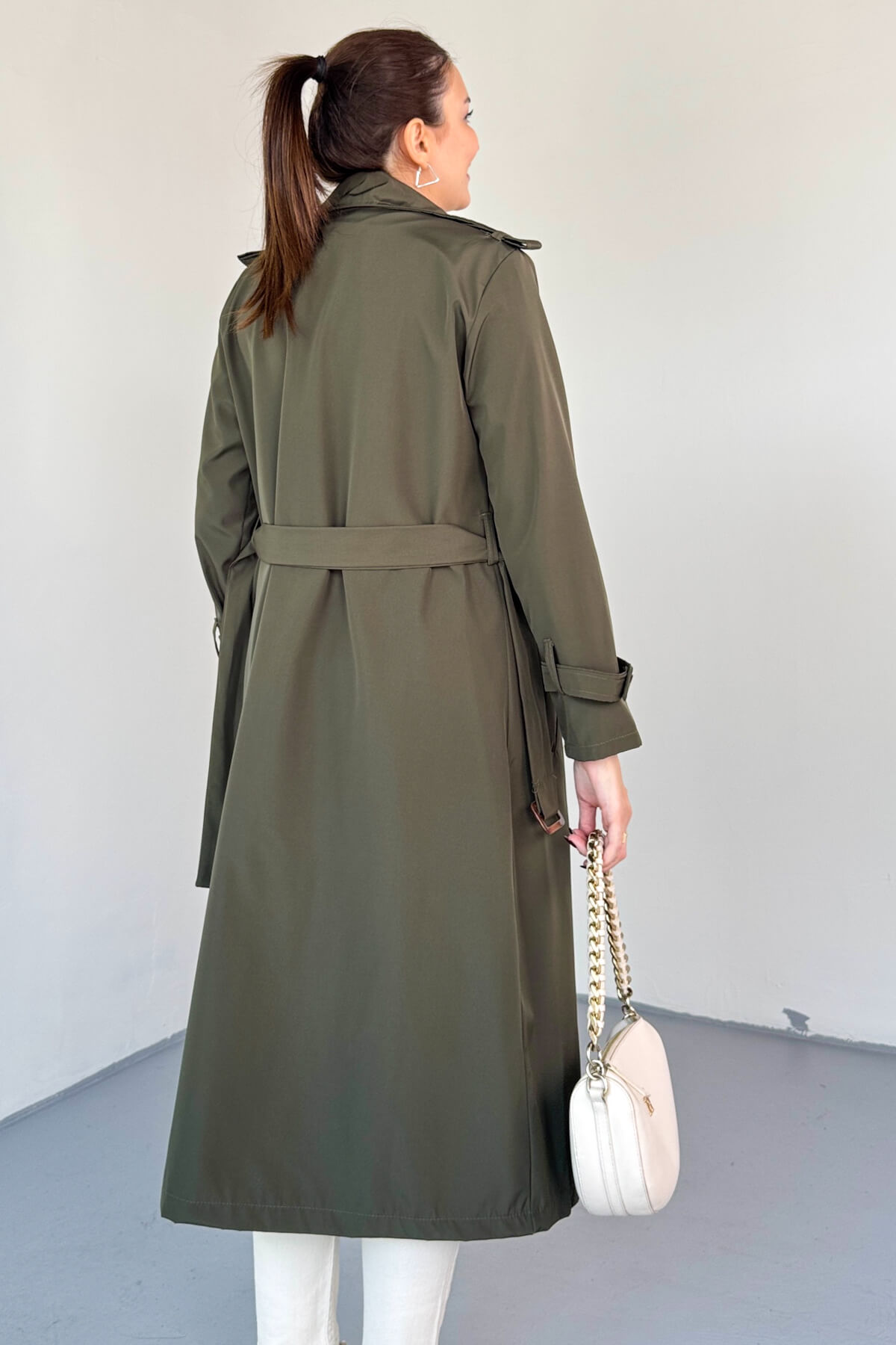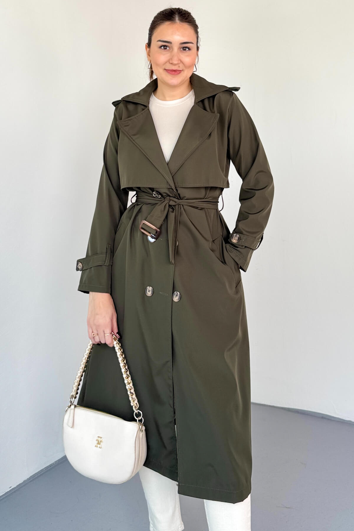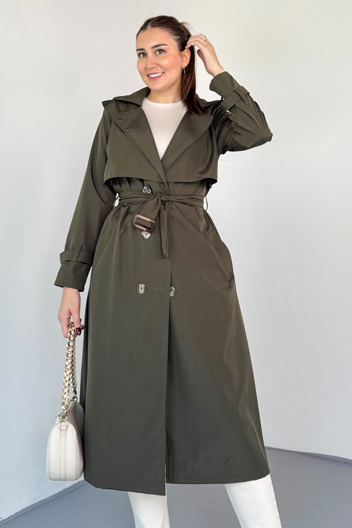 Çift düğmeli tasarım klasik trençkot görünümünü tamamlar