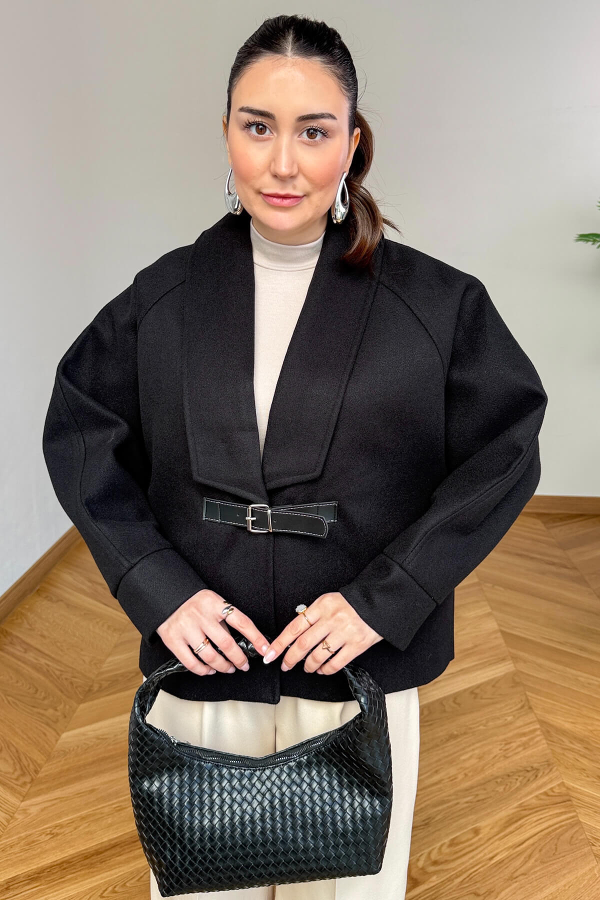 Ön kısmındaki deri tokalı kemer, ceketin siluetini toplar ve premium bir detay kazandırır.