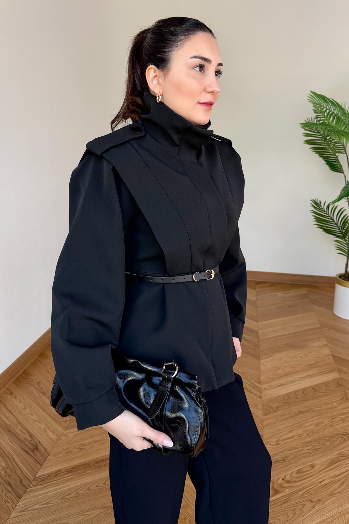 Dik yaka tasarımı modern ve güçlü bir siluet oluşturur.