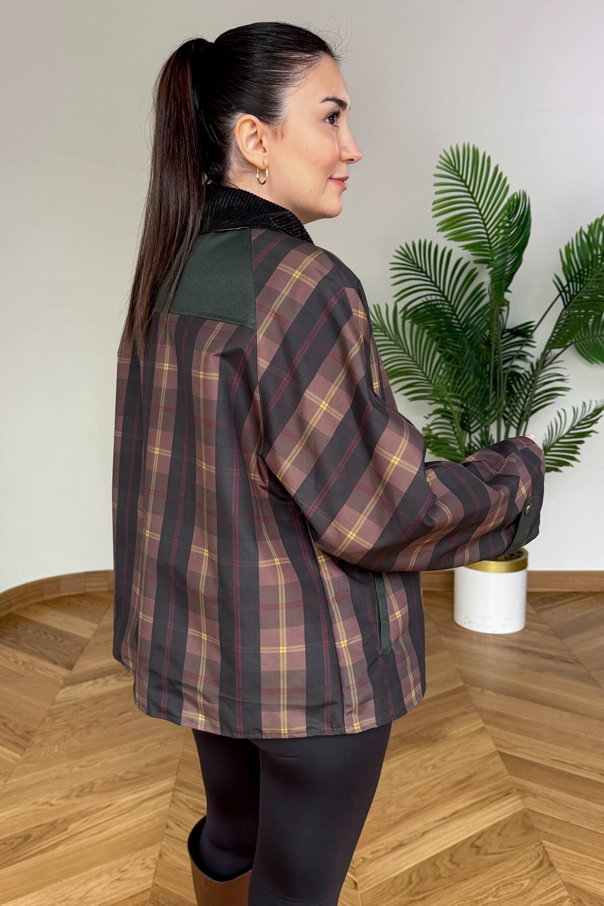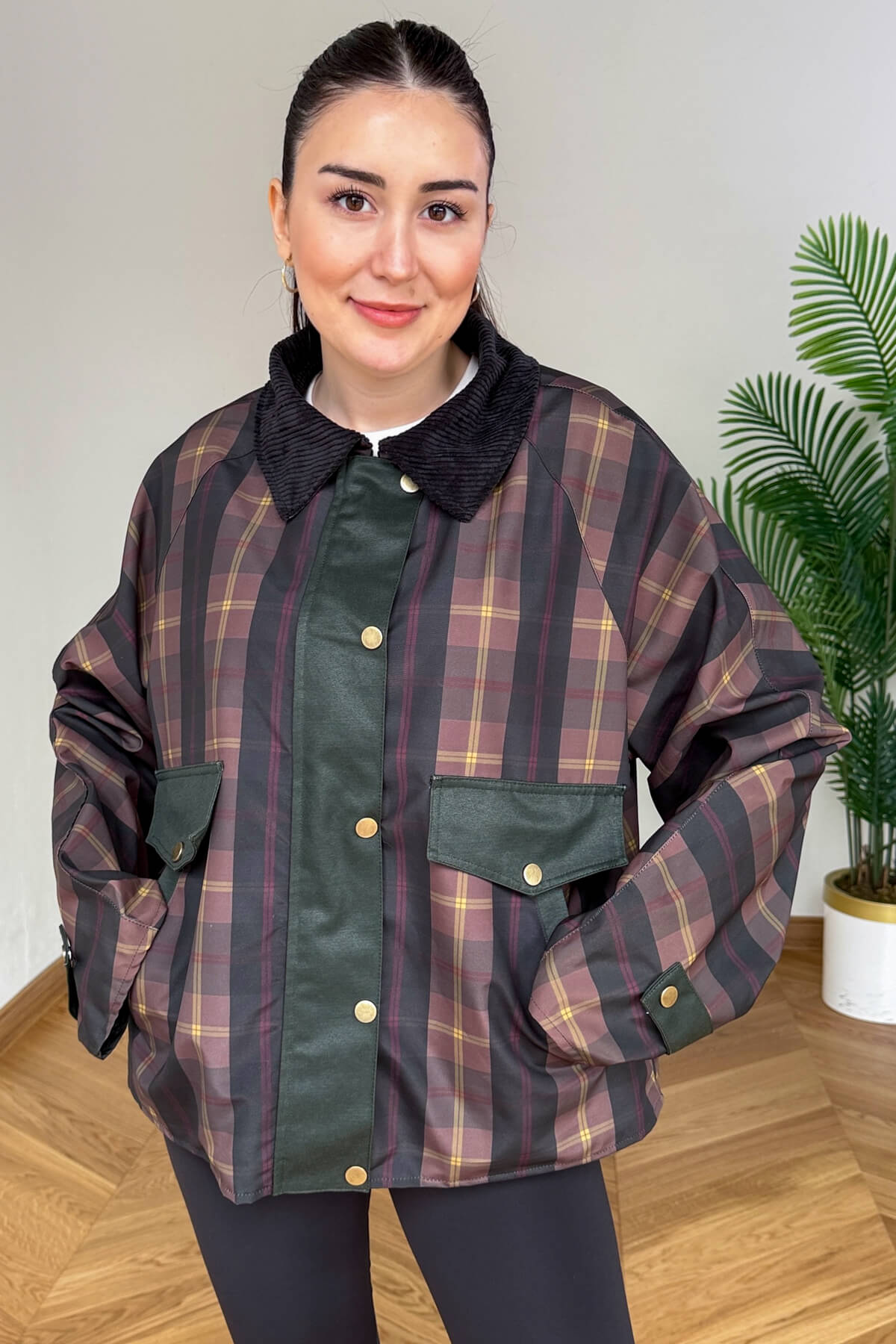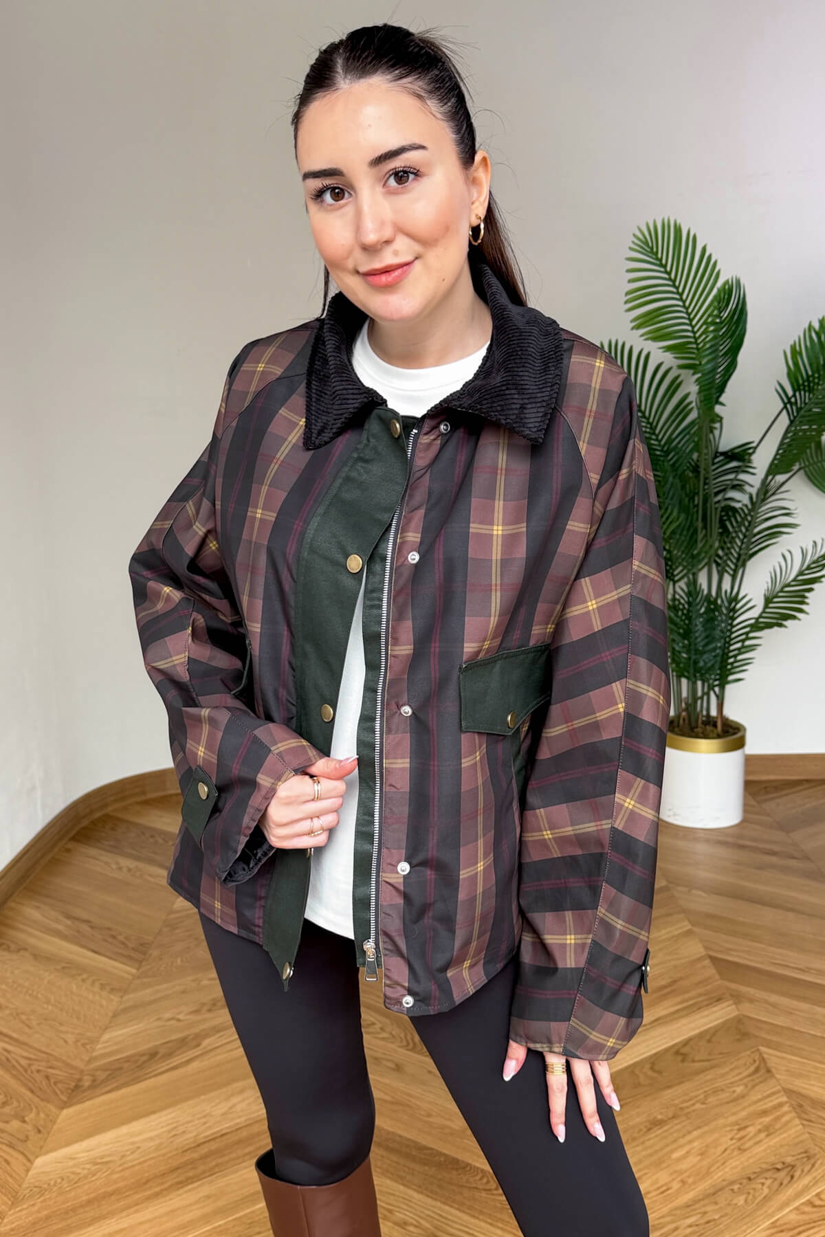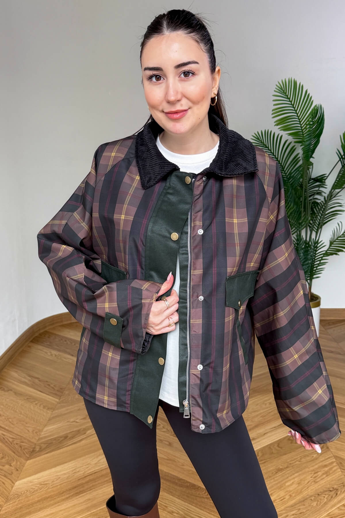 Mumlanmış (wax) efektli özel dokusu ve klasik ekose deseniyle bu ceket, stilinize seçkin bir hava katıyor. Yaka kısmındaki yumuşak kadife detayı tasarıma şık bir kontrast sağlarken, tam astarlı iç yapısı serin havalarda konforlu bir kullanım sunar. Fermuar üzerine eklenen çıtçıtlı kapama paneli rüzgar koruması sağlarken, geniş cep detayları günlük kullanımda pratiklik yaratır.