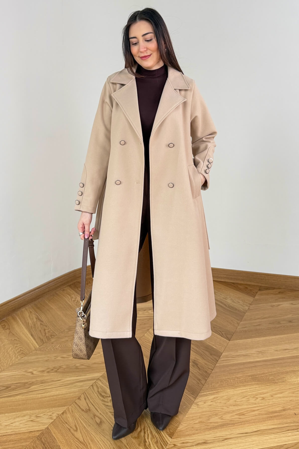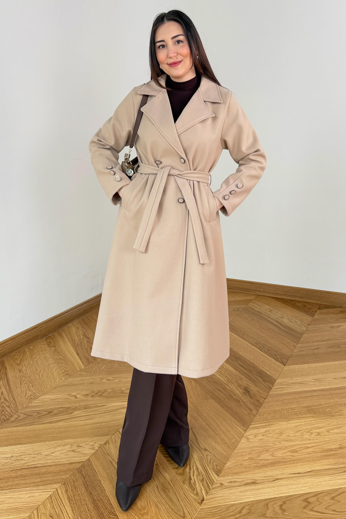Zamansız şıklığın en güçlü temsilcisi olan bu kaban, premium kaşe kumaşın sunduğu tok duruş ve yumuşak dokuyu kusursuz bir tasarımla buluşturuyor. 110 cm ideal boy uzunluğu ve sofistike kruvaze yaka kesimiyle modern bir silüet çizen parça, kuşaklı bel tasarımı sayesinde vücut formunuzu zarifçe vurguluyor. Manşetlerdeki metal düğme detaylarıyla zenginleştirilen bu tasarım, soğuk havalarda hem sıcak kalmanızı sağlıyor.