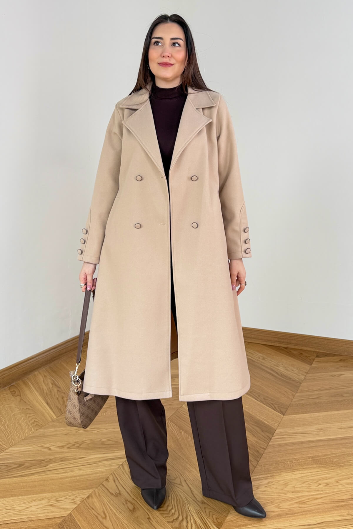 Tasarım Detayı: Manşetlerde yer alan üçlü metal düğme detayı ve şık kruvaze yaka.