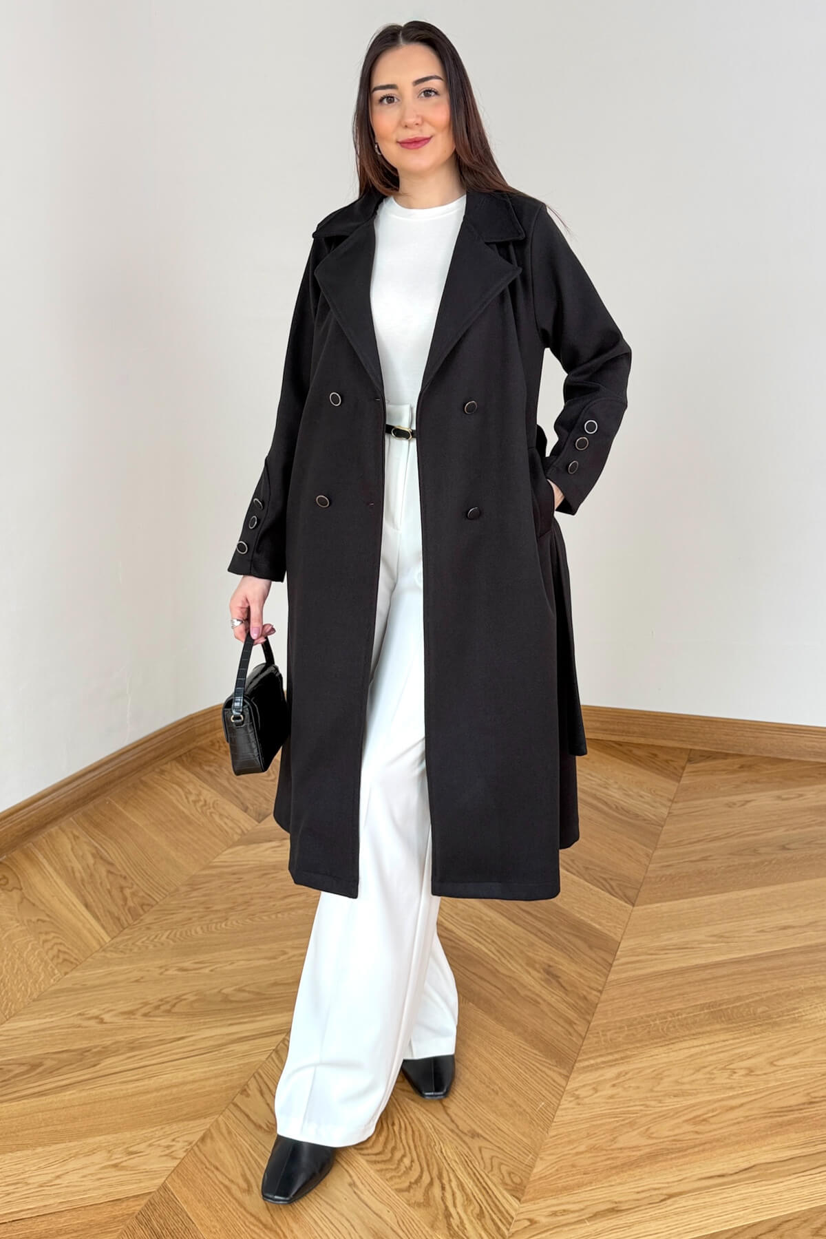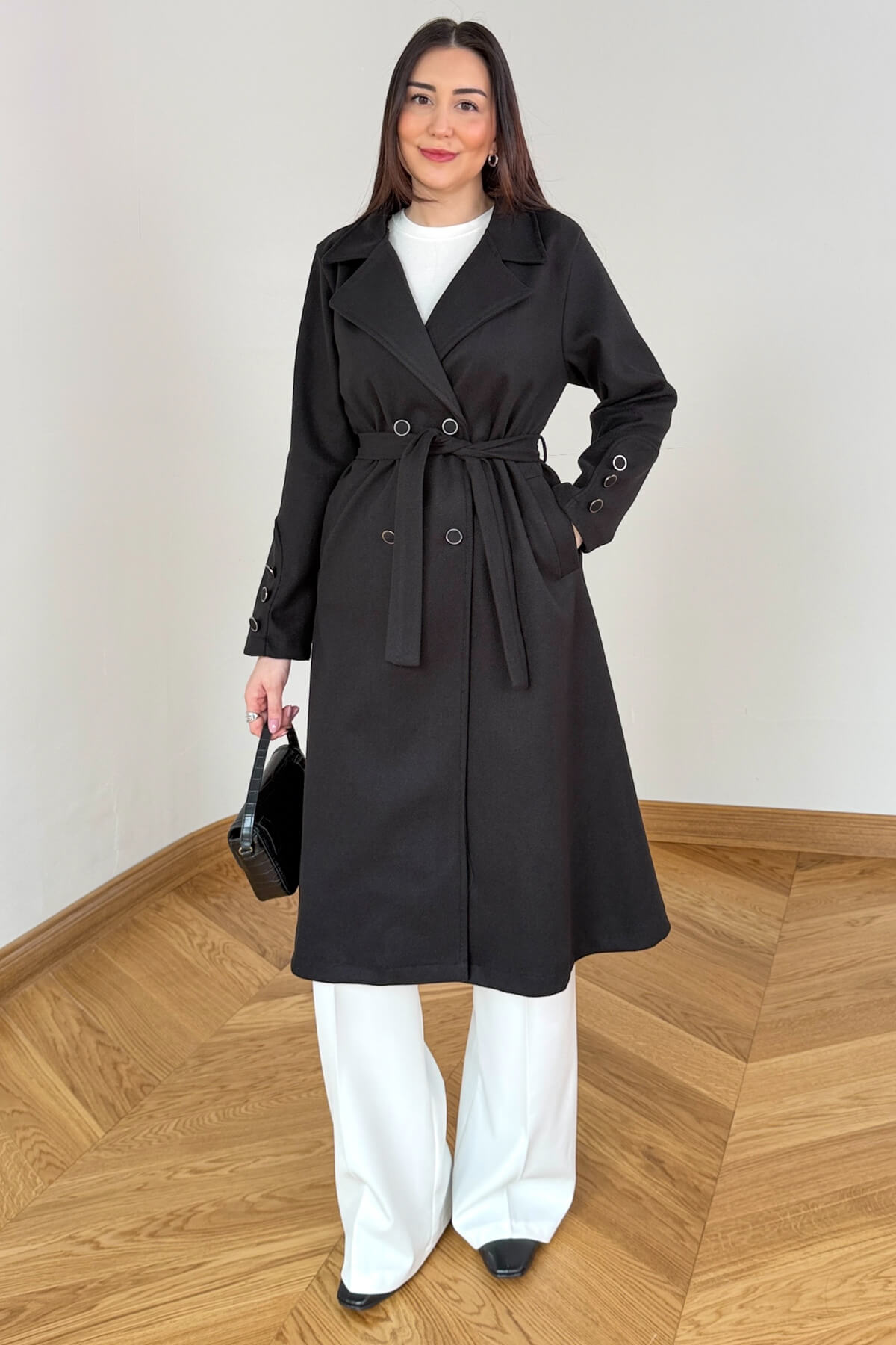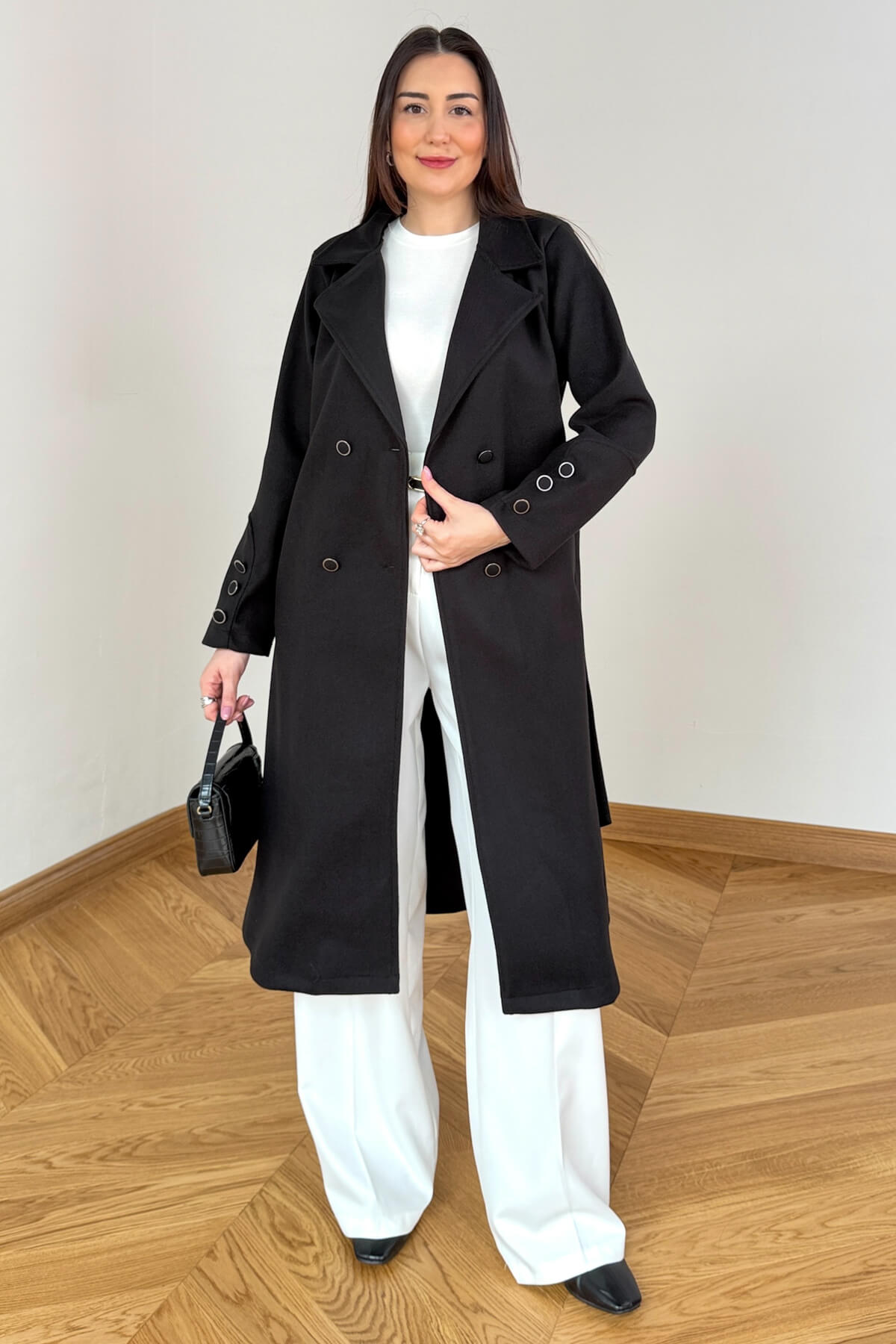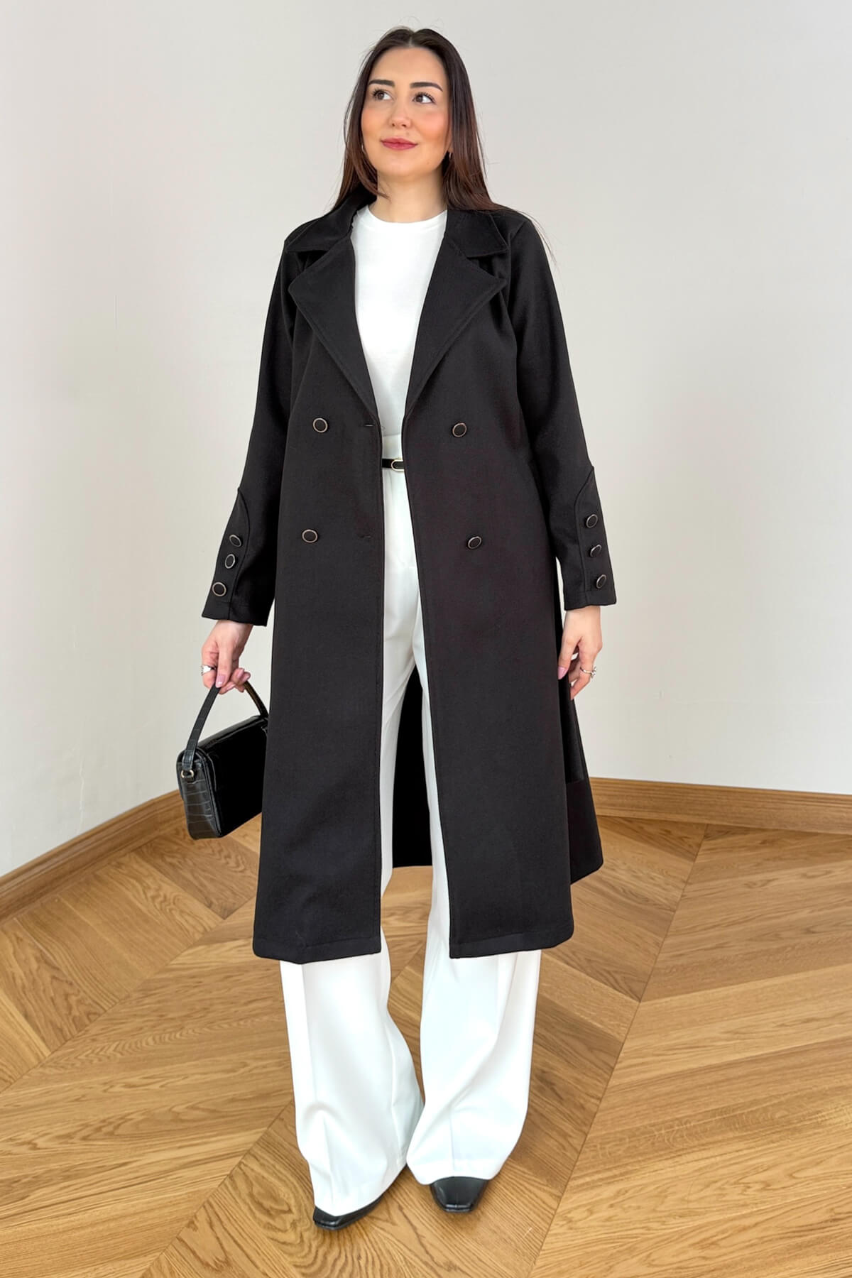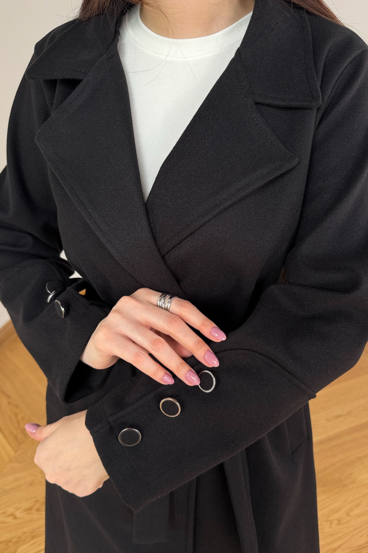 Tasarım Detayı: Manşetlerde yer alan üçlü metal düğme detayı ve şık kruvaze yaka.