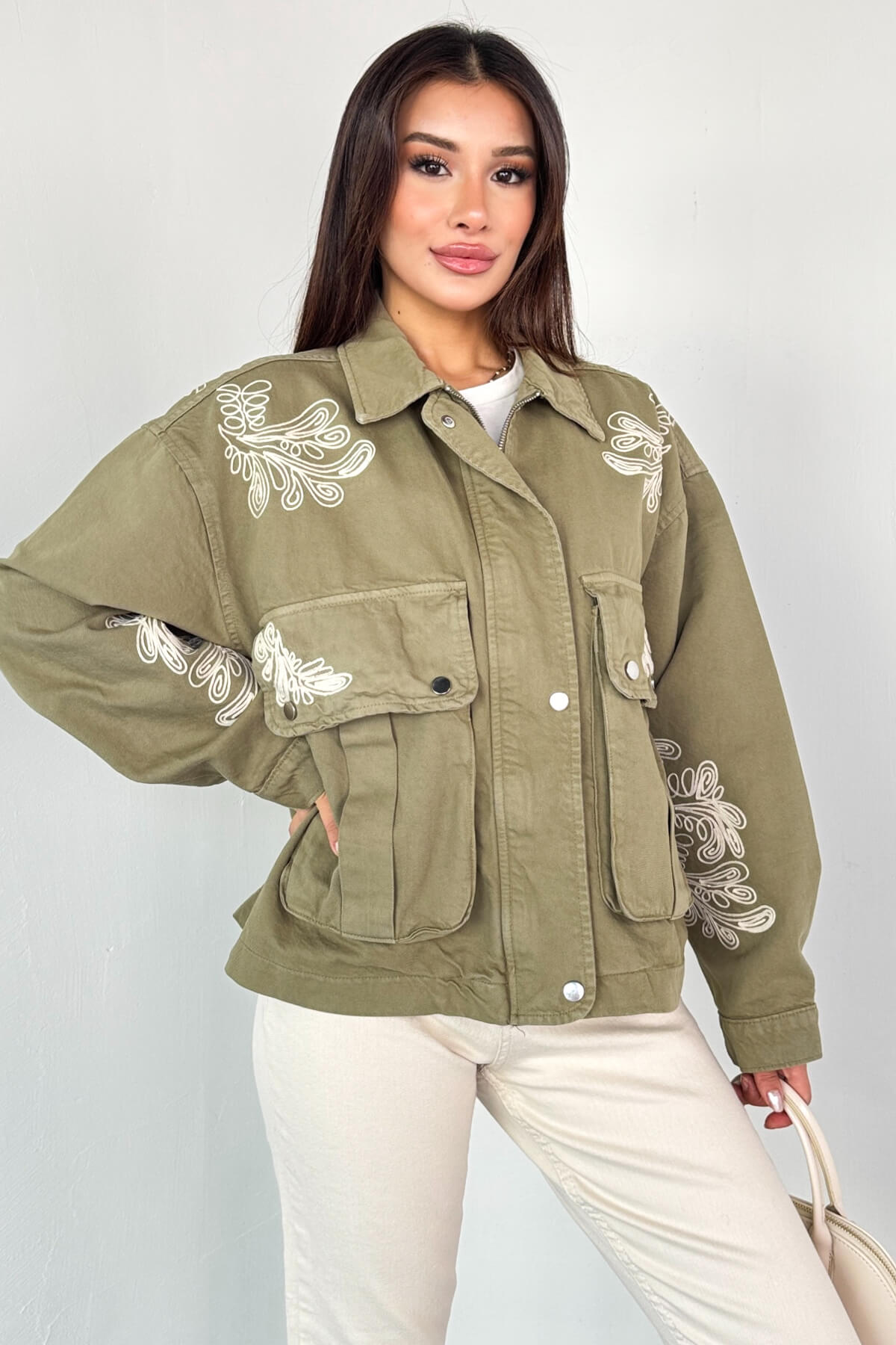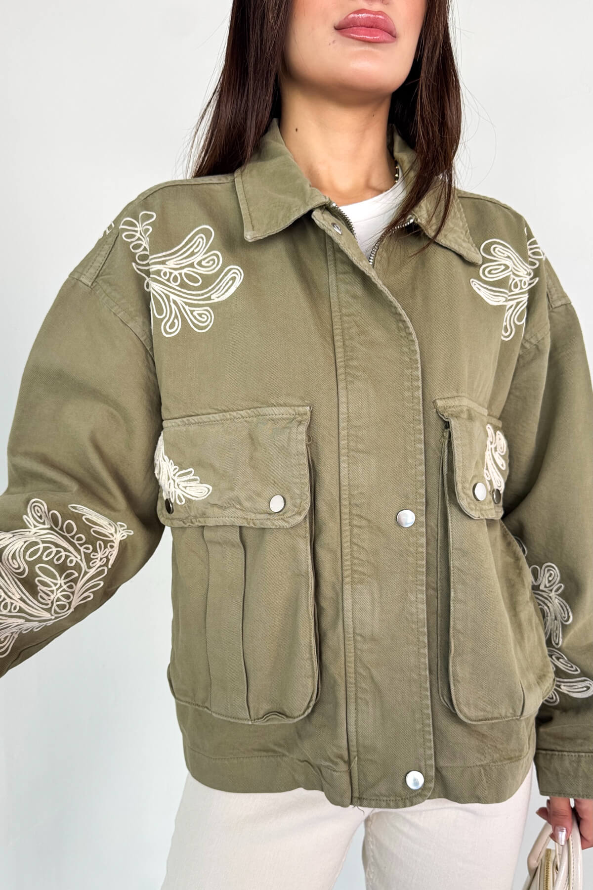 Beyaz kontrast nakış detayları ile şık görünüm