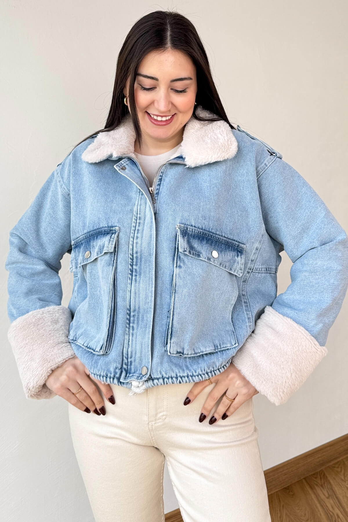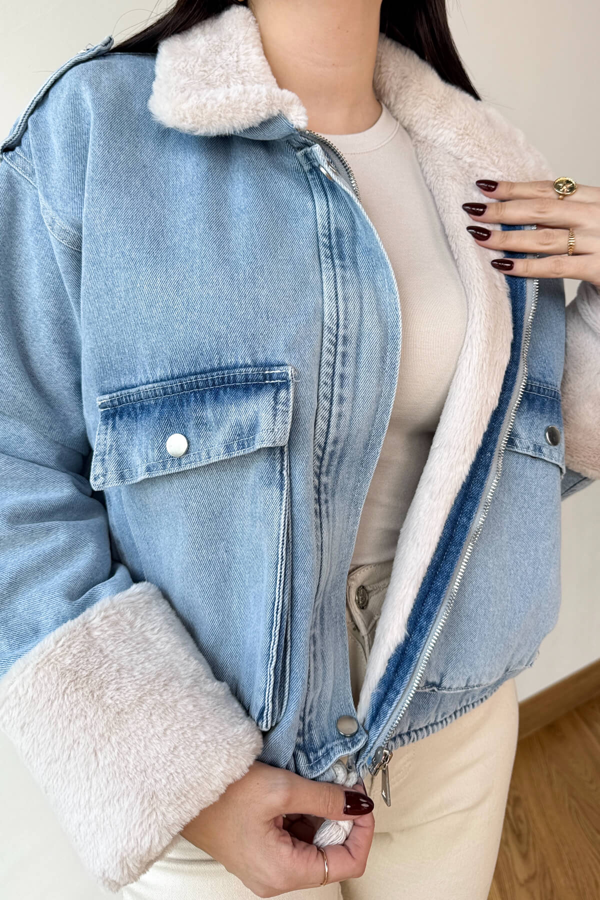 Bej kürklü yaka ve kol manşetleri ile şık detay