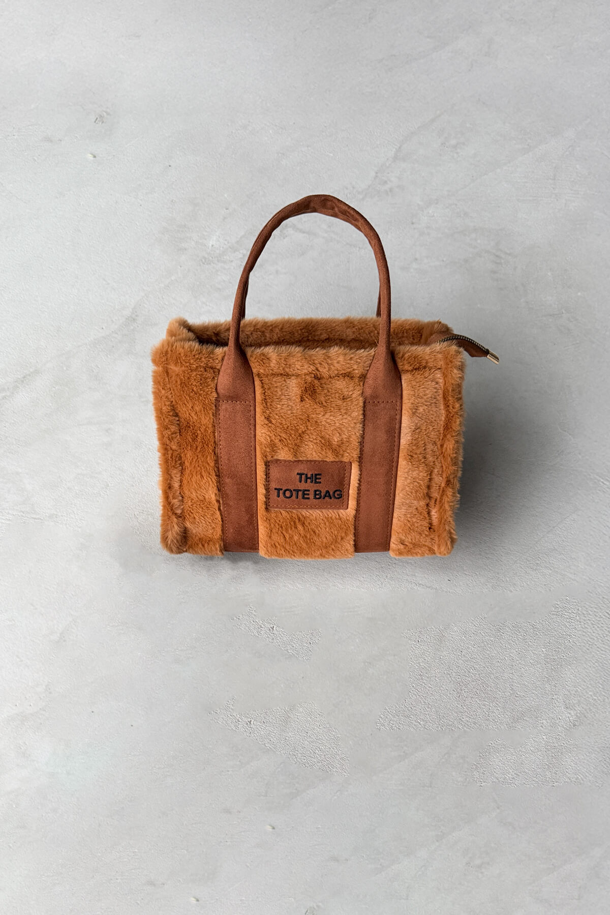 ÇNT-3002 Taba Kürklü Kumaş Yazı Detaylı El Ve Omuz Çantası