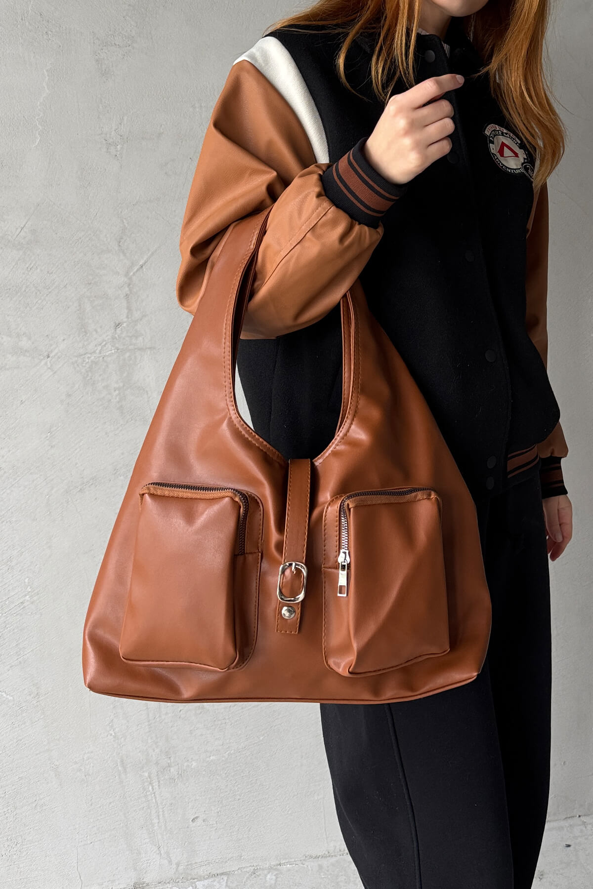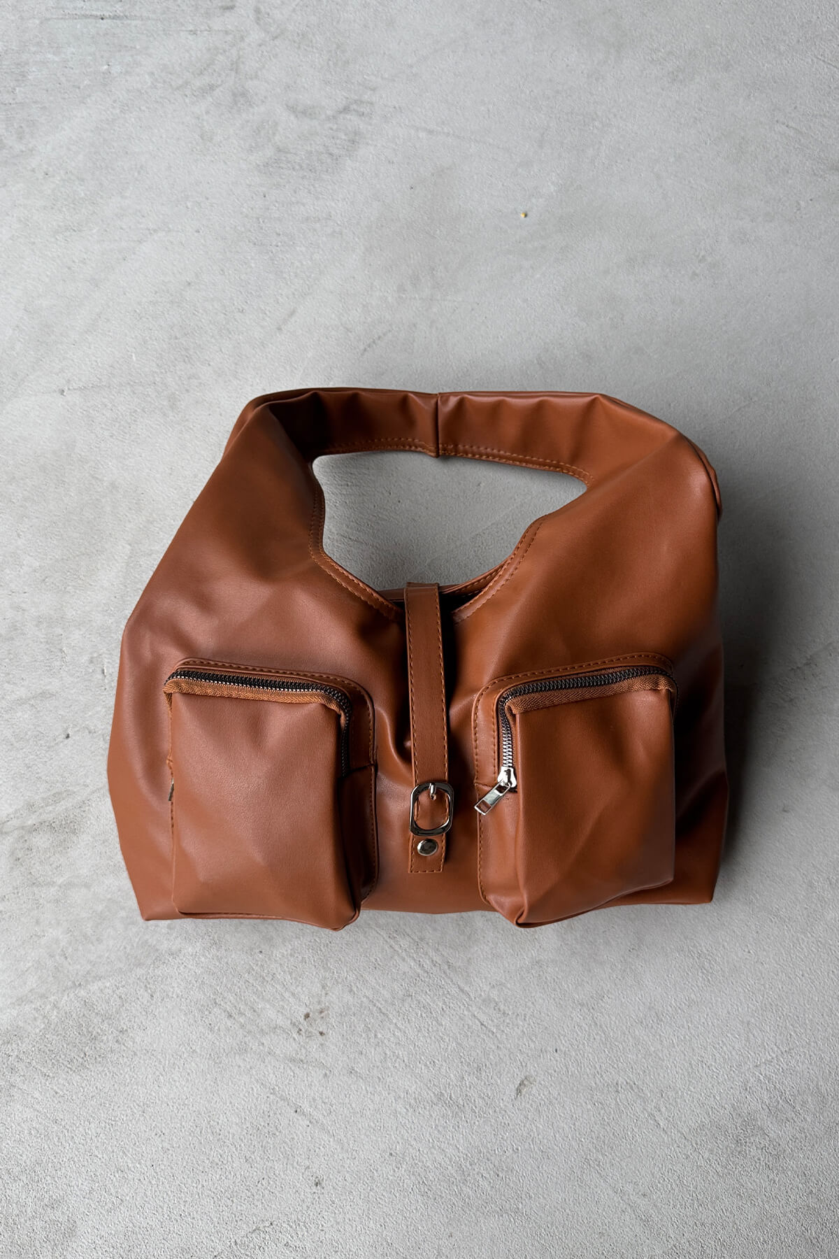 ÇNT-3012 Taba Çok Gözlü Büyük Boy Yumuşak Suni Deri Omuz Çantası