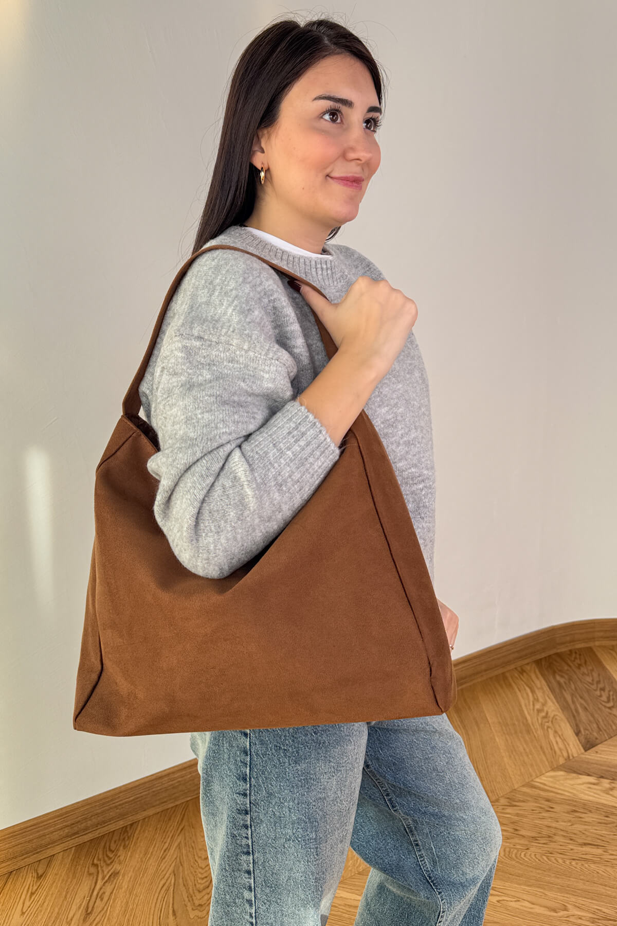 Süet dokulu dış yüzey ile yumuşak ve şık bir görünüm sunar.