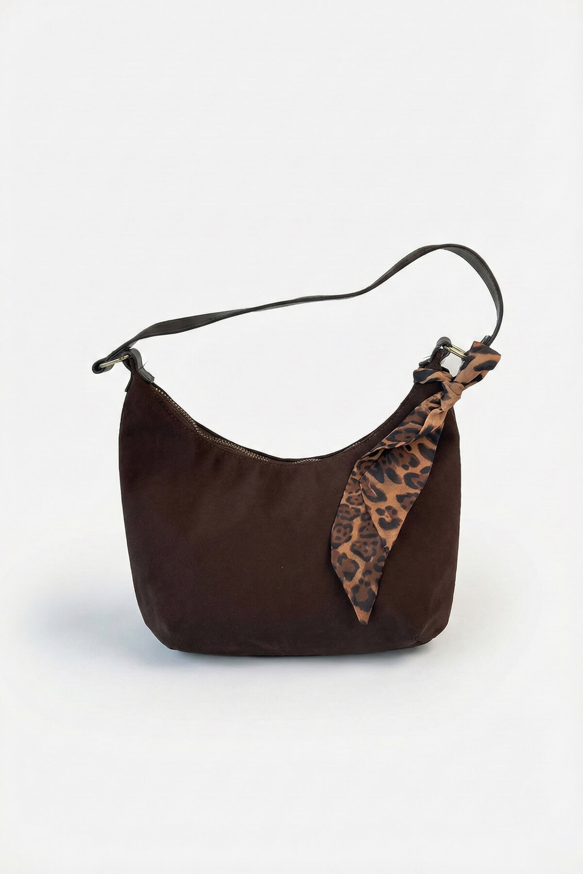 Desenli fular detayı, çantaya sofistike bir dokunuş katar.