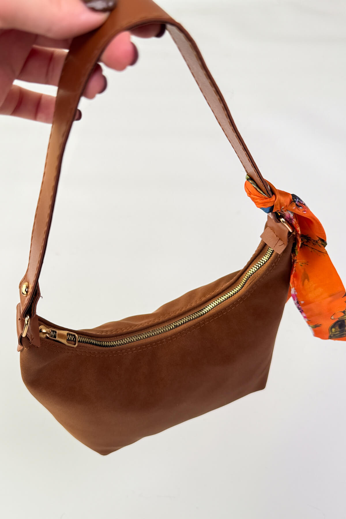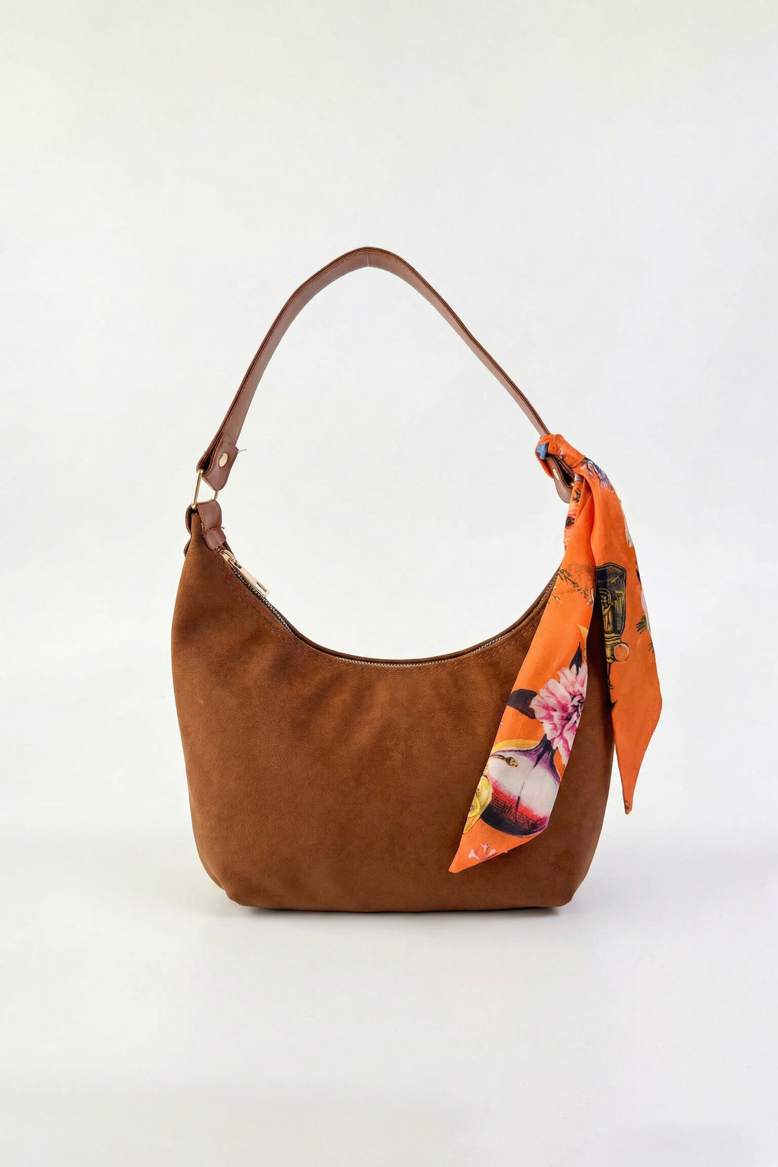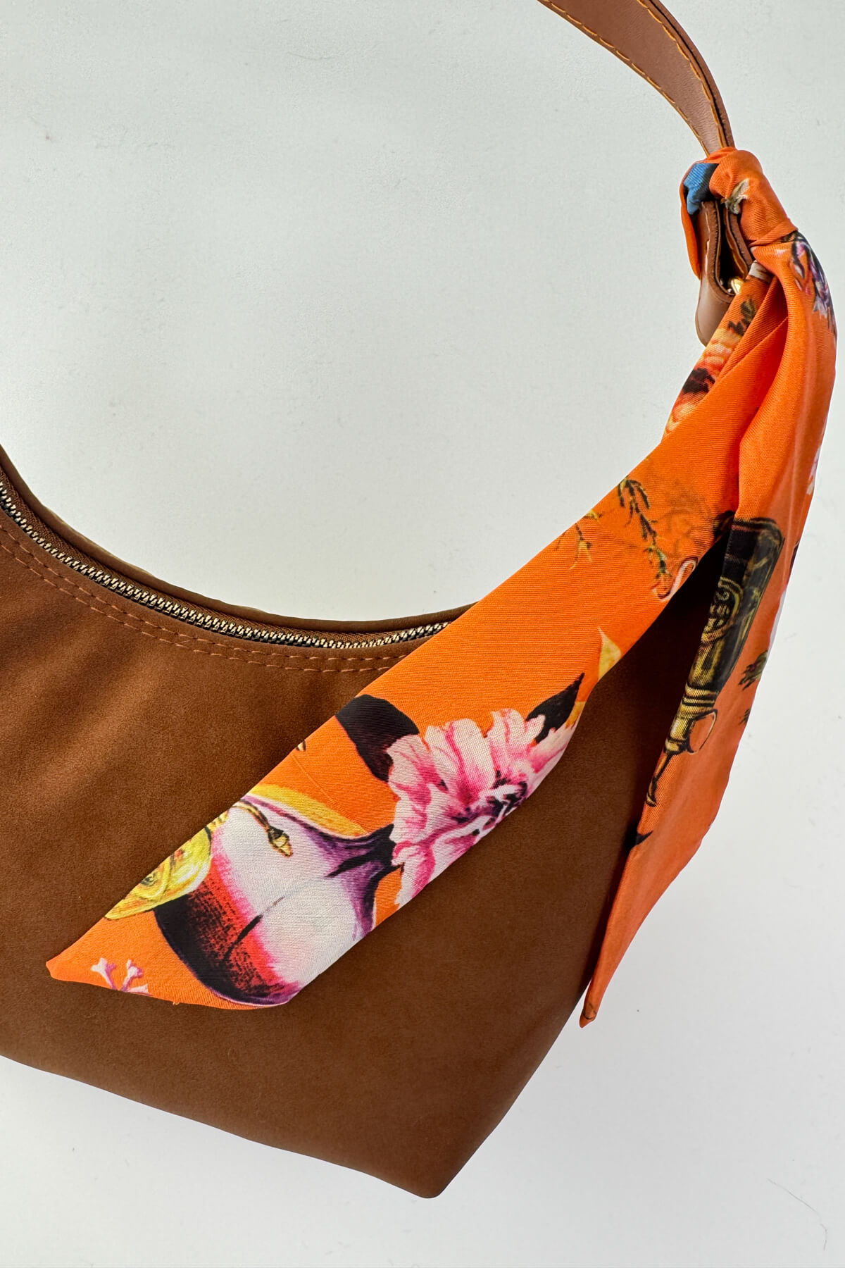 Desenli fular detayı, çantaya sofistike bir dokunuş katar.