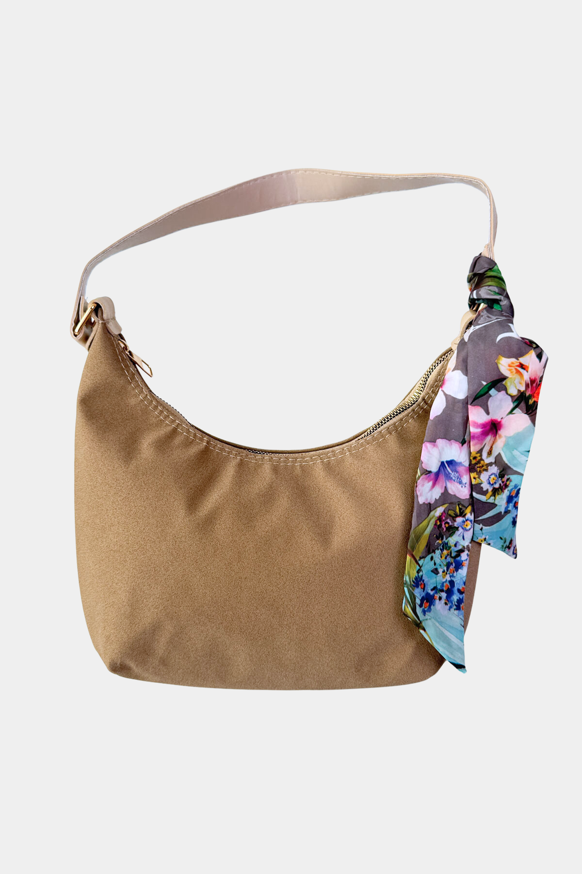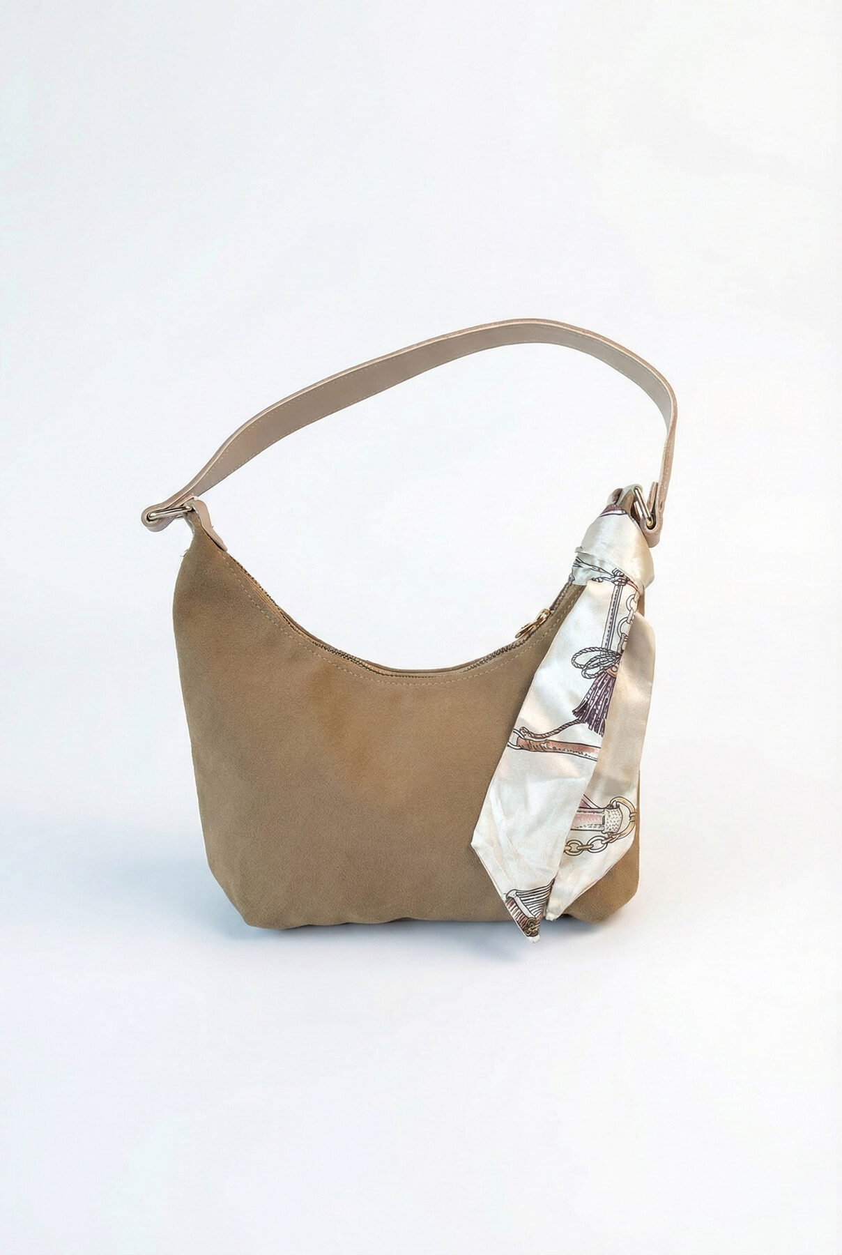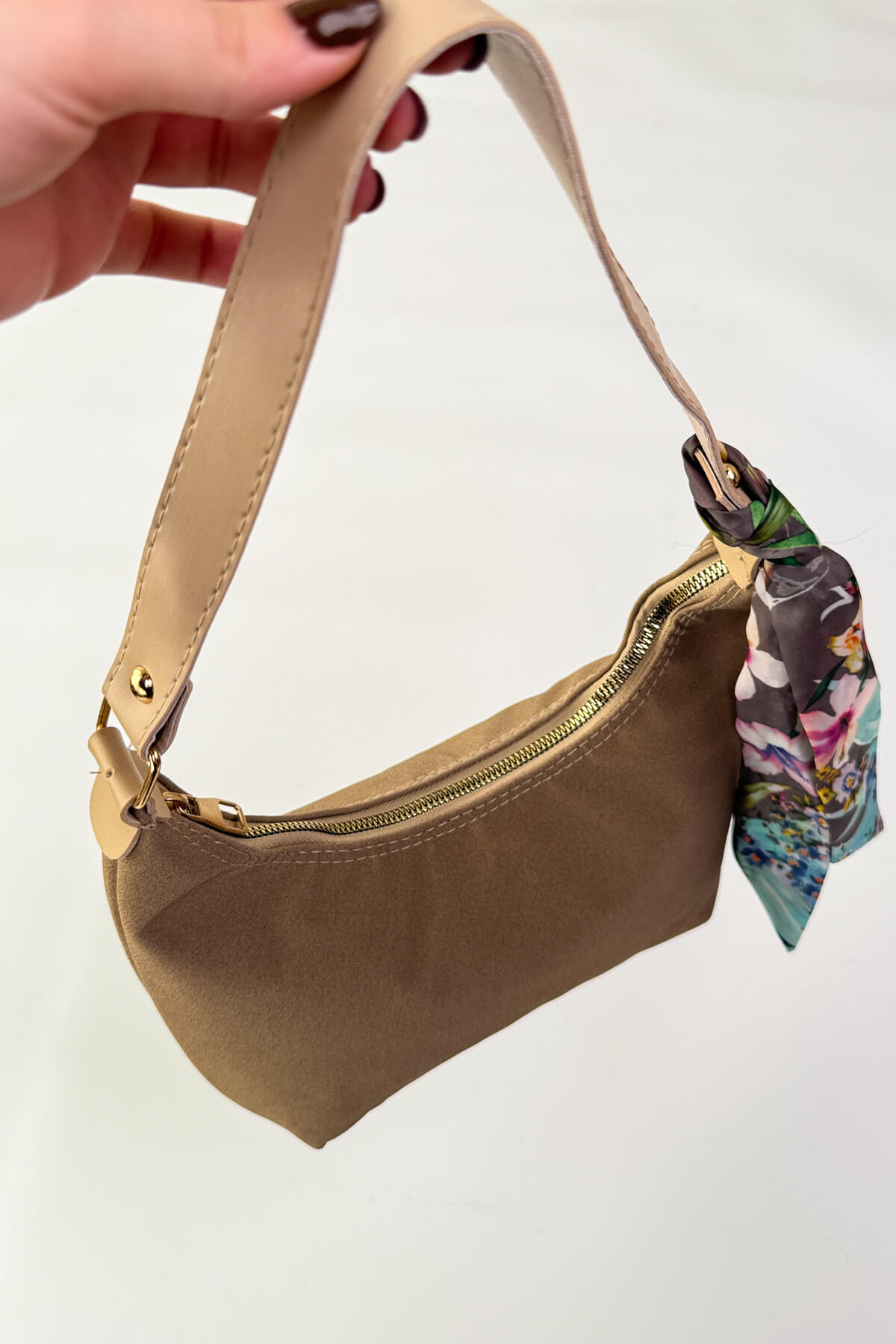 Desenli fular detayı, çantaya sofistike bir dokunuş katar.