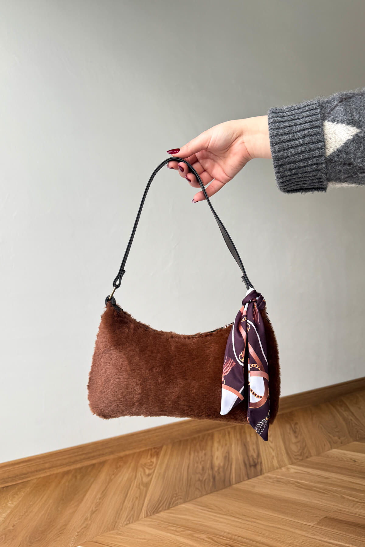 Sezonun en sıcak trendlerinden biri olan kürk dokusu, bu özel tasarım çantada sofistike bir şıklıkla buluşuyor. Yumuşacık kahverengi kürk yüzeyi, kombininize lüks ve modern bir hava katarken, sap kısmındaki zarif desenli fular detayı tasarıma hareket kazandırıyor. Hem gündüz trikolarıyla hem de gece şıklığında kullanabileceğiniz bu çanta, yumuşak dokusu ve estetik duruşuyla stilinizin tamamlayıcı parçası olacak.