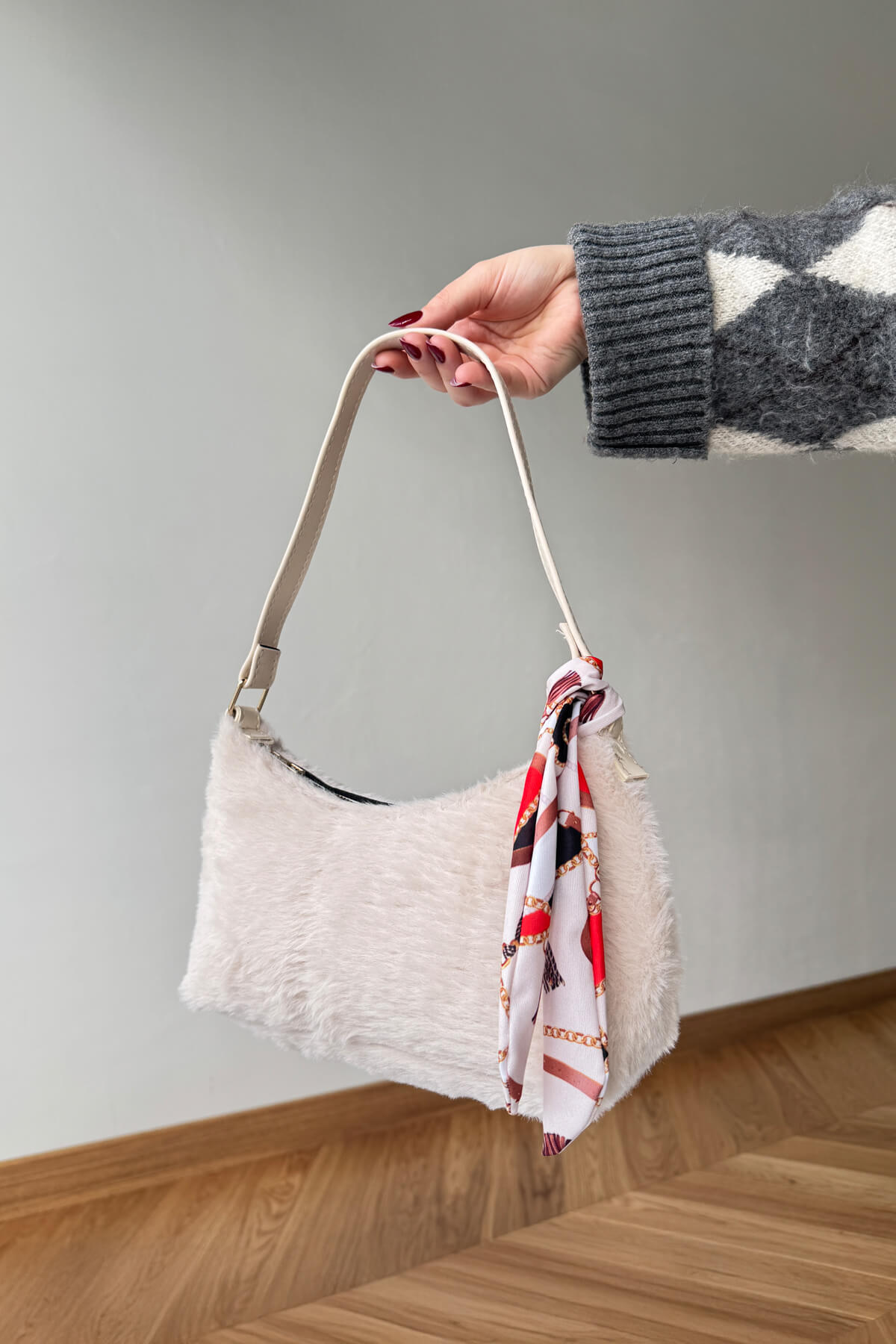 Sezonun en sıcak trendlerinden biri olan kürk dokusu, bu özel tasarım çantada sofistike bir şıklıkla buluşuyor. Yumuşacık kahverengi kürk yüzeyi, kombininize lüks ve modern bir hava katarken, sap kısmındaki zarif desenli fular detayı tasarıma hareket kazandırıyor. Hem gündüz trikolarıyla hem de gece şıklığında kullanabileceğiniz bu çanta, yumuşak dokusu ve estetik duruşuyla stilinizin tamamlayıcı parçası olacak.