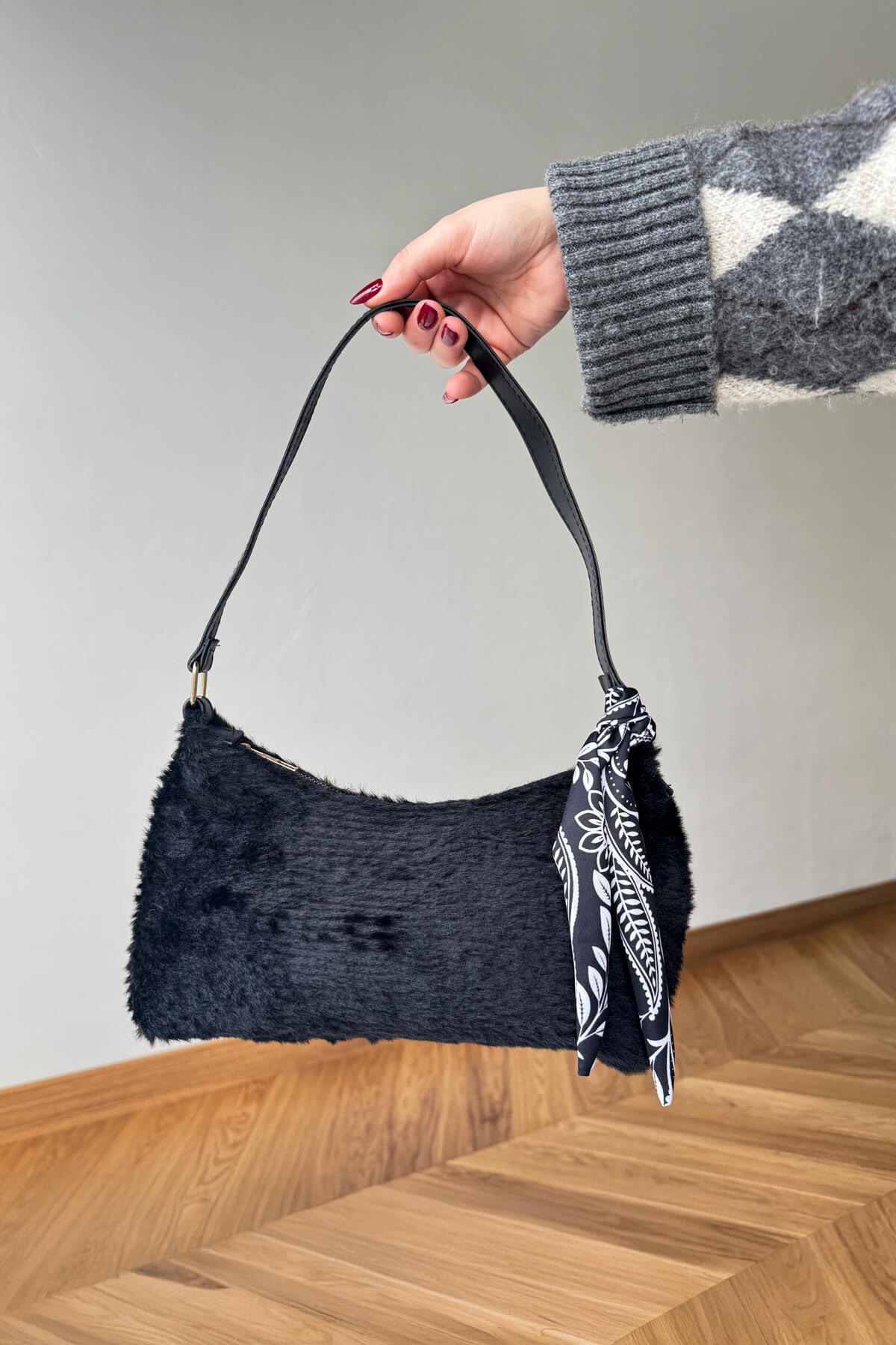 Sezonun en sıcak trendlerinden biri olan kürk dokusu, bu özel tasarım çantada sofistike bir şıklıkla buluşuyor. Yumuşacık kahverengi kürk yüzeyi, kombininize lüks ve modern bir hava katarken, sap kısmındaki zarif desenli fular detayı tasarıma hareket kazandırıyor. Hem gündüz trikolarıyla hem de gece şıklığında kullanabileceğiniz bu çanta, yumuşak dokusu ve estetik duruşuyla stilinizin tamamlayıcı parçası olacak.