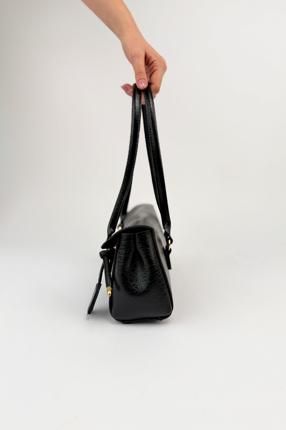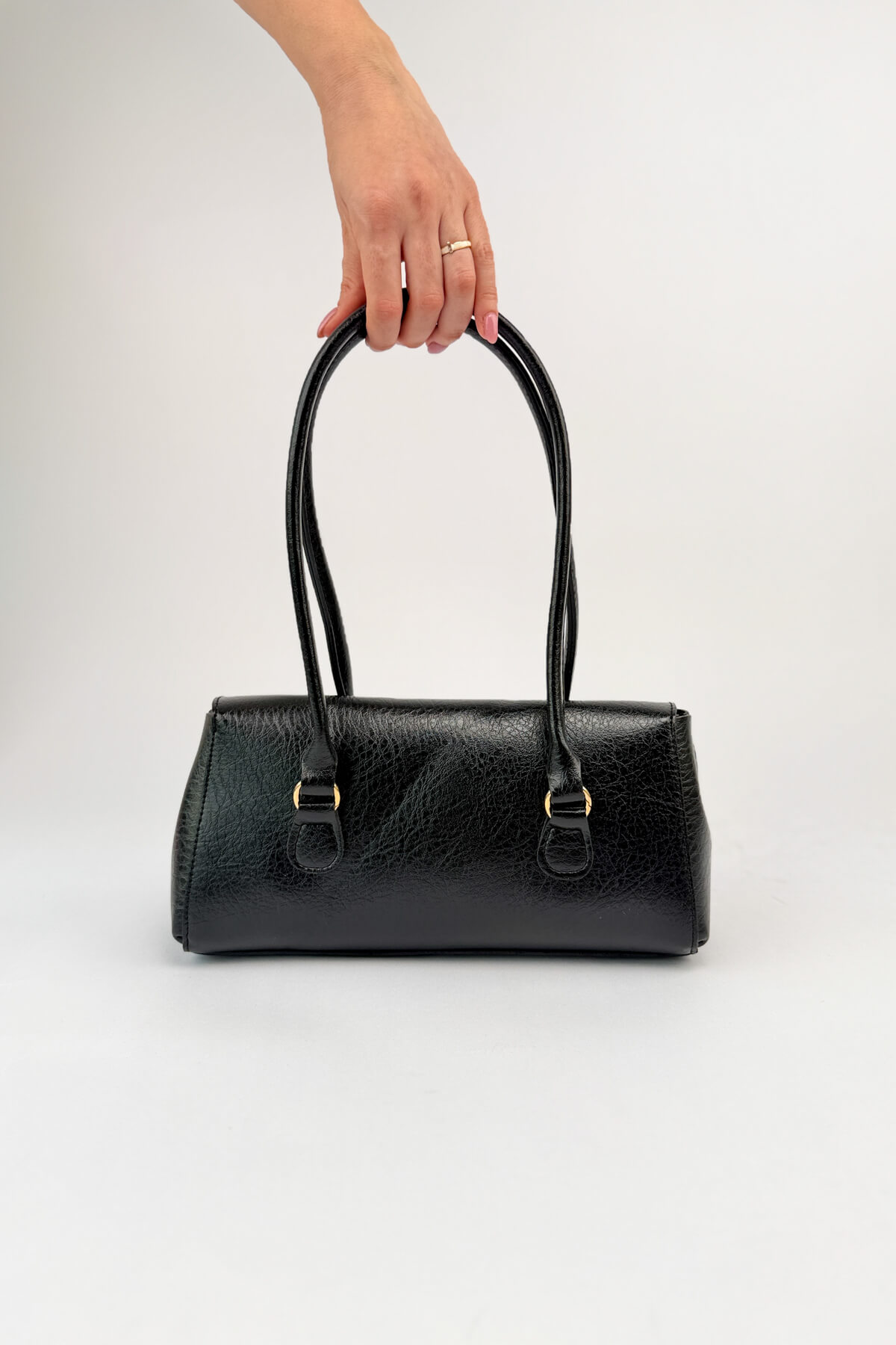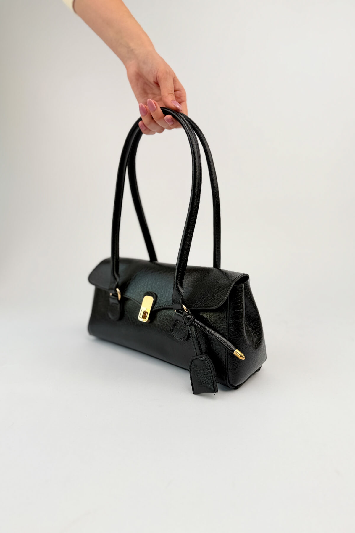 Retro esintileri modern bir dokunuşla birleştiren bu çanta, yumuşak dokulu suni derisi ve zarif silüetiyle stilinize iddialı bir imza atıyor. Kapaklı tasarımı üzerinde parlayan gold dikey kilit detayı, çantaya aristokrat bir hava katarken, dokulu deri yüzeyi ışığı kusursuz şekilde yansıtıyor. 30 cm uzunluğundaki ideal formu ve ince uzun omuz askılarıyla hem omuzda hem de elde taşımaya uygun olan bu çanta, gündüzden geceye geçiş yapan kombinlerinizin en sofistike parçası olacak.