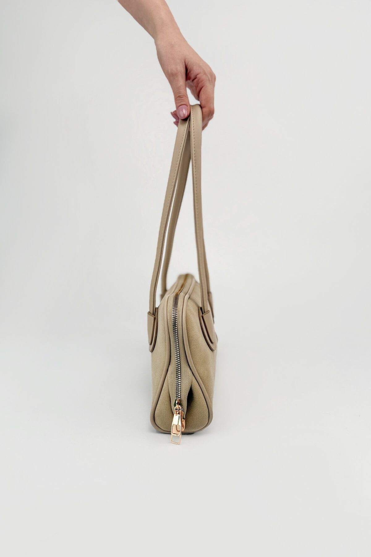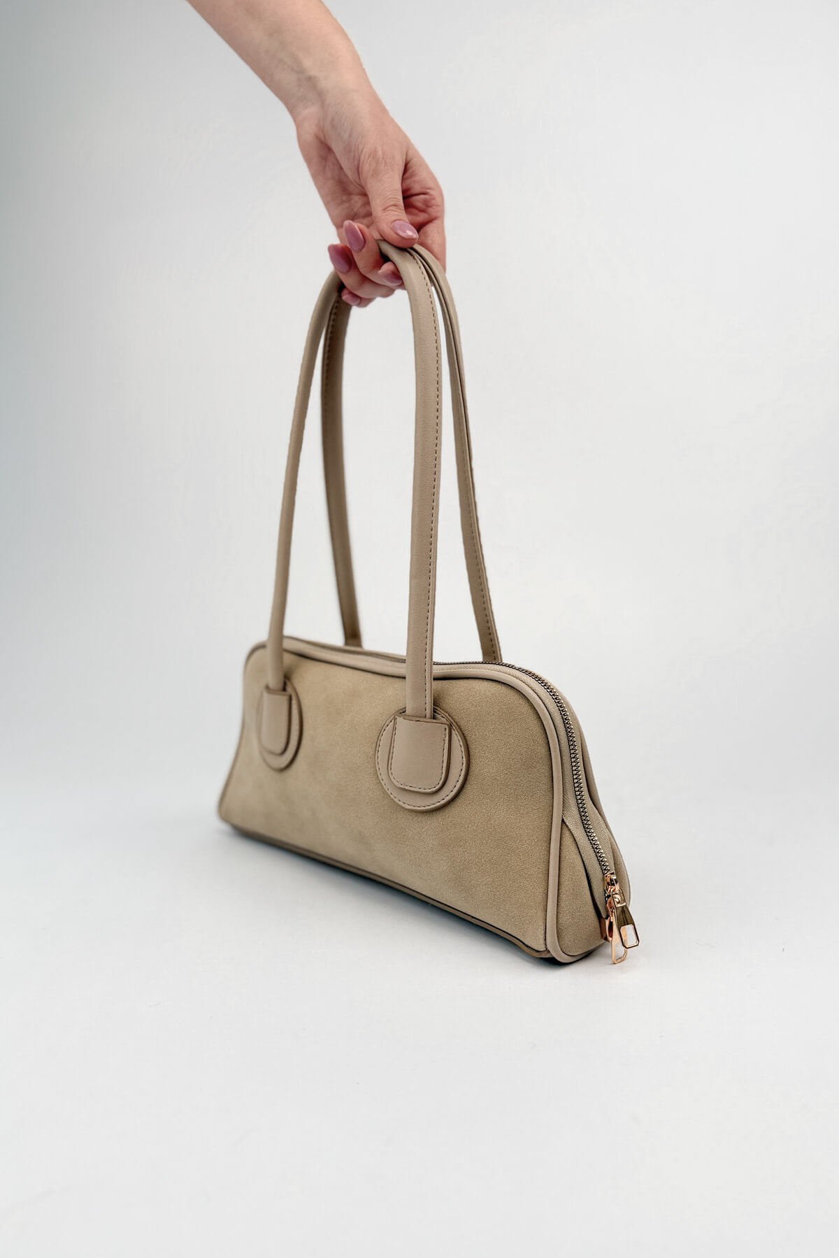 Nubuk dokusunun kadifemsi yumuşaklığını minimalist bir tasarımla buluşturan bu çanta, çabasız şıklığın en güncel temsilcisi olmaya aday. Gövdeyle bütünleşen yuvarlak hatlı askı bağlantıları ve yalın silüeti, çantaya zamansız bir estetik kazandırıyor. 32 cm uzunluğundaki kompakt yapısı ve ferah iç hacmiyle gün boyu konfor sağlarken, fermuarlı kapama özelliğiyle eşyalarınızı güvenle taşımanıza imkan tanıyor. Hem dokusuyla hem de formuyla "sessiz lüks" stilini gardırobunuza taşıyacak özel bir parça.