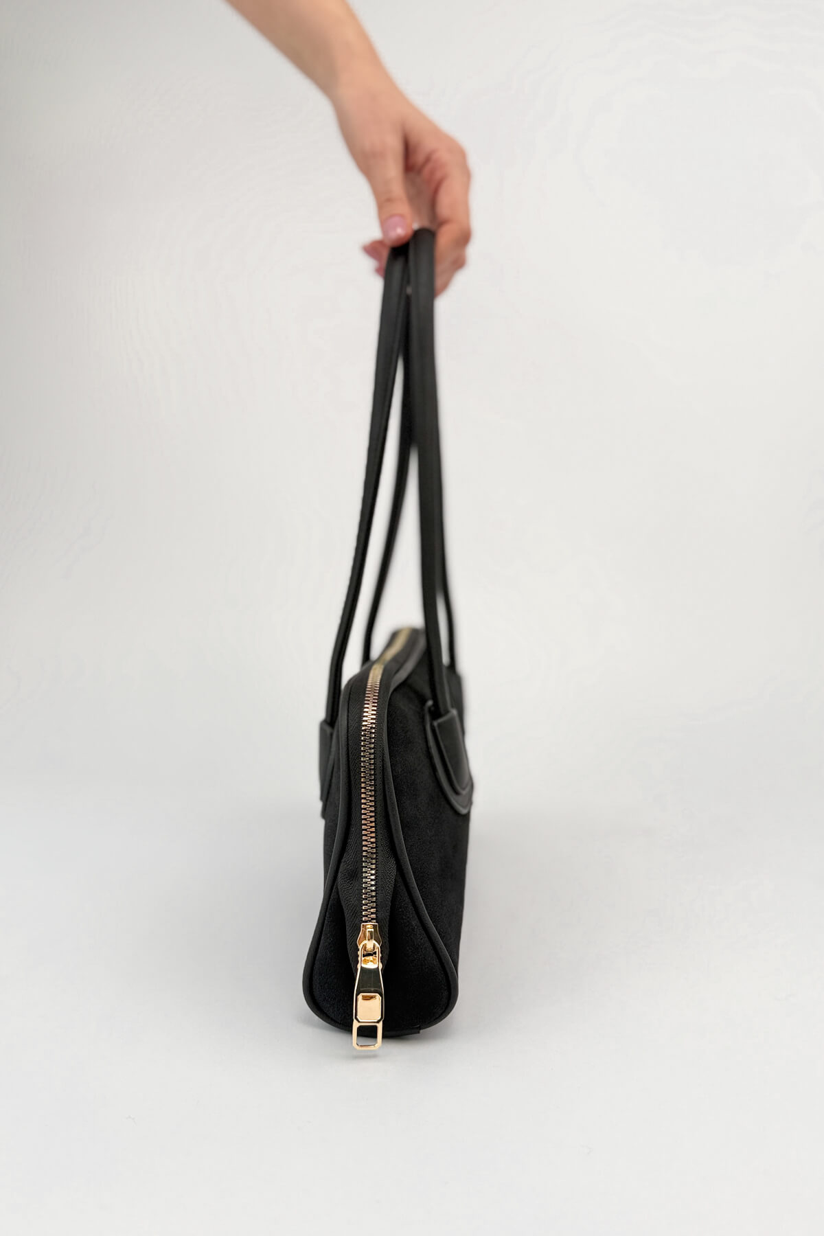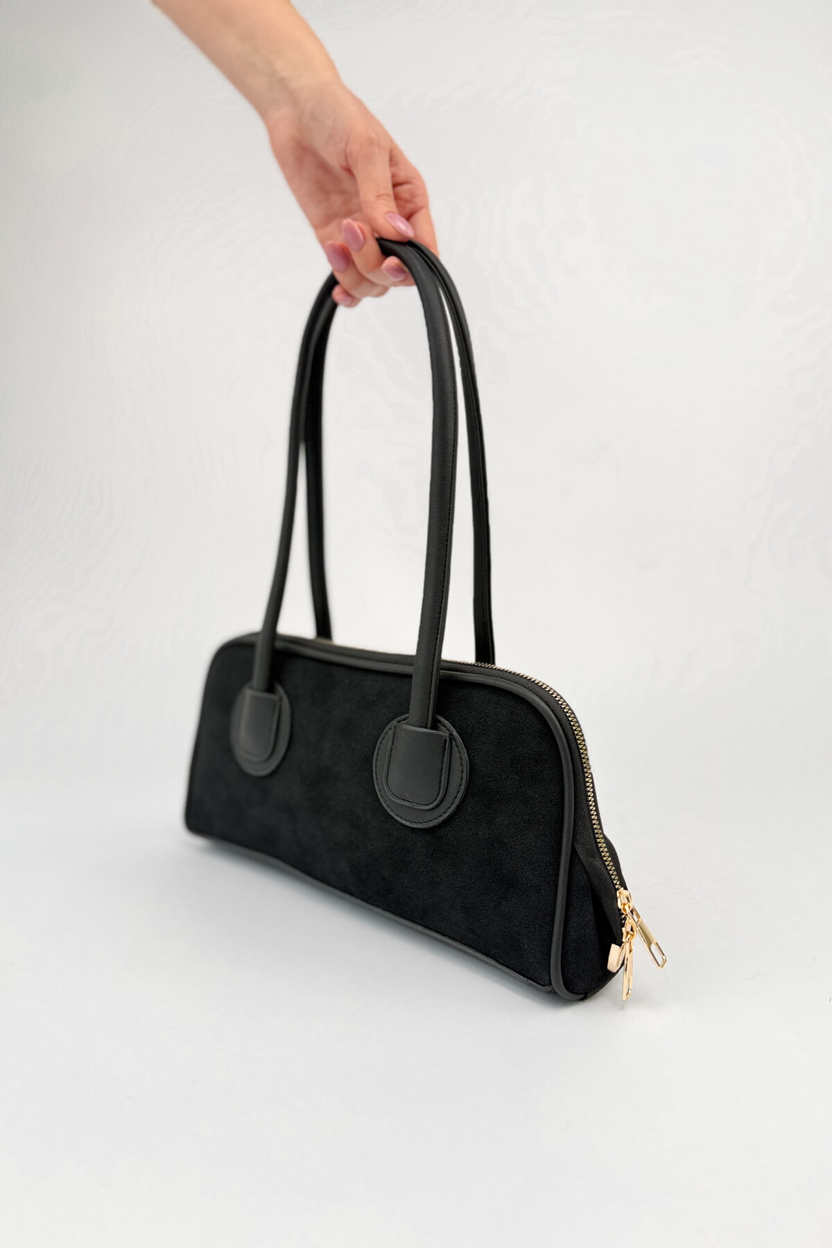 Nubuk dokusunun kadifemsi yumuşaklığını minimalist bir tasarımla buluşturan bu çanta, çabasız şıklığın en güncel temsilcisi olmaya aday. Gövdeyle bütünleşen yuvarlak hatlı askı bağlantıları ve yalın silüeti, çantaya zamansız bir estetik kazandırıyor. 32 cm uzunluğundaki kompakt yapısı ve ferah iç hacmiyle gün boyu konfor sağlarken, fermuarlı kapama özelliğiyle eşyalarınızı güvenle taşımanıza imkan tanıyor. Hem dokusuyla hem de formuyla "sessiz lüks" stilini gardırobunuza taşıyacak özel bir parça.