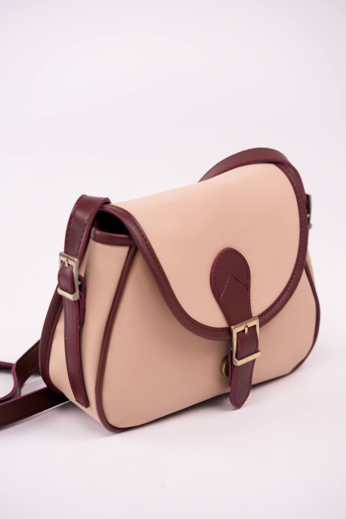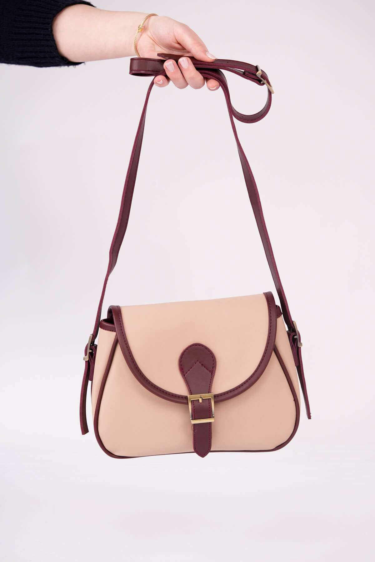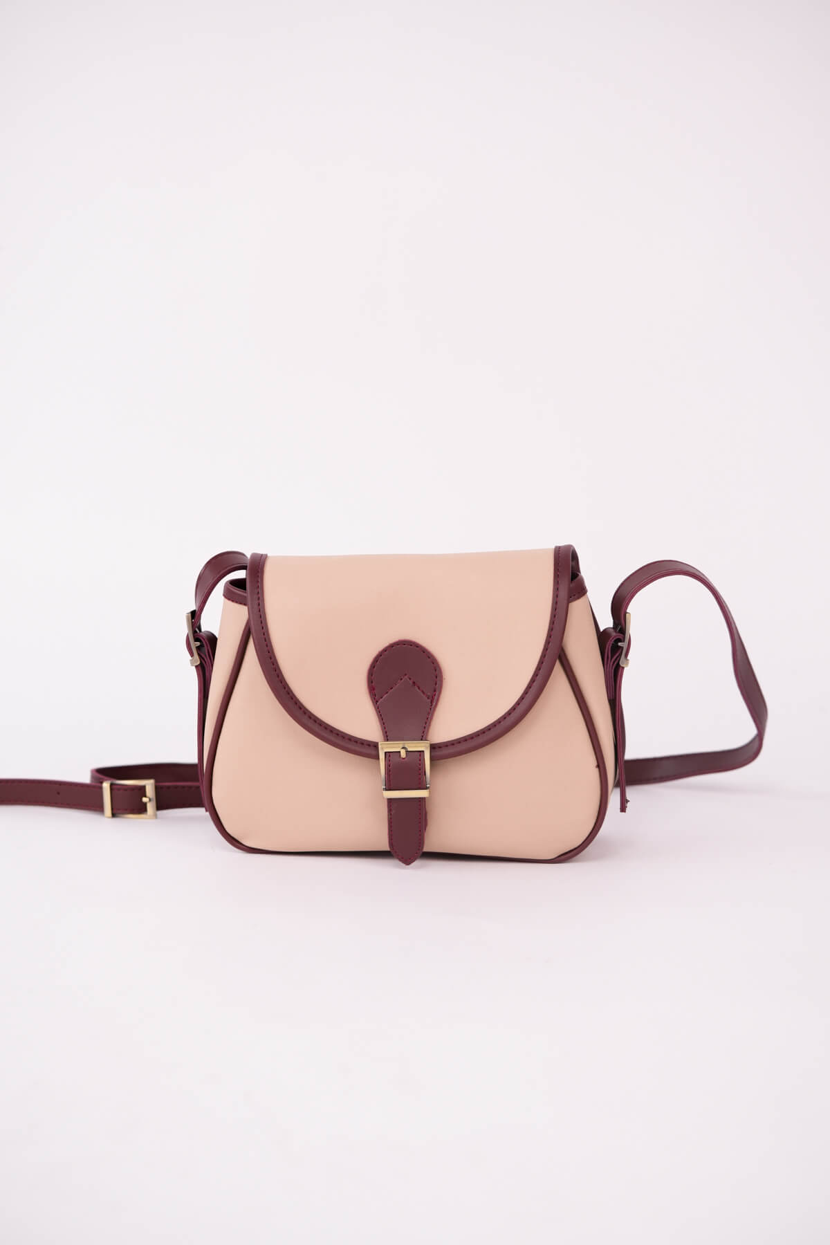 ÇNT-3055 Bej Bordo Kemer Tokalı Kapaklı Omuz Çantası