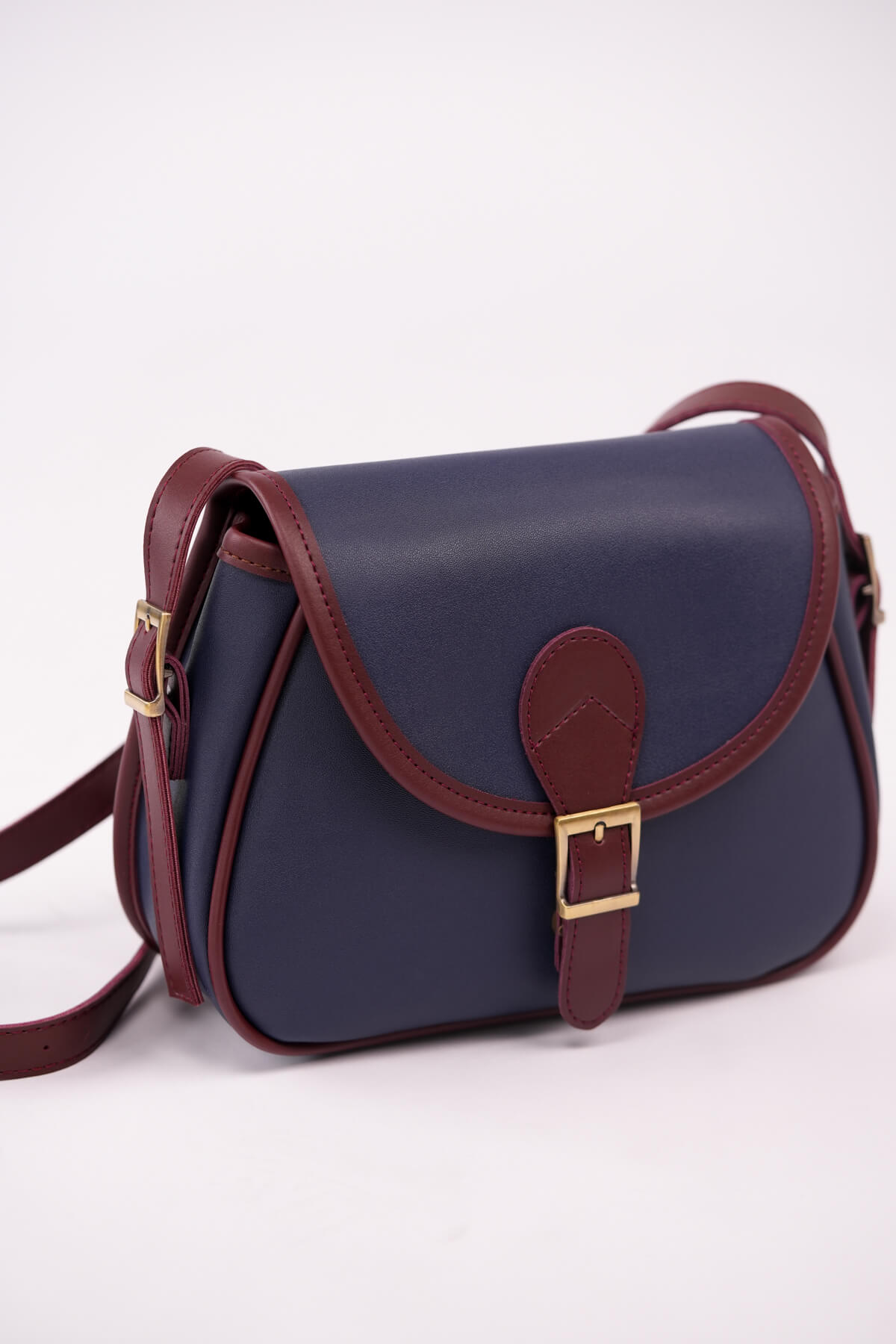 ÇNT-3055 Lacivert Bordo Kemer Tokalı Kapaklı Omuz Çantası