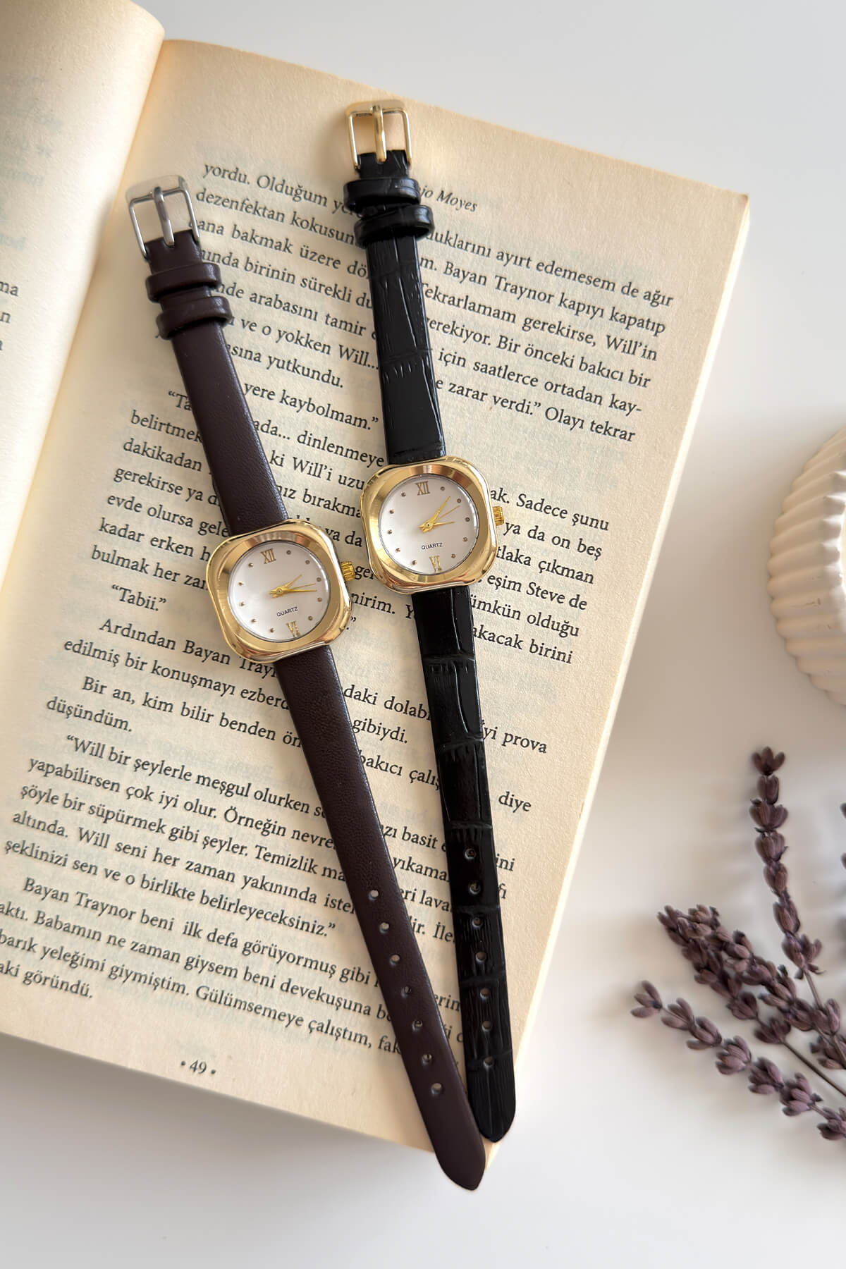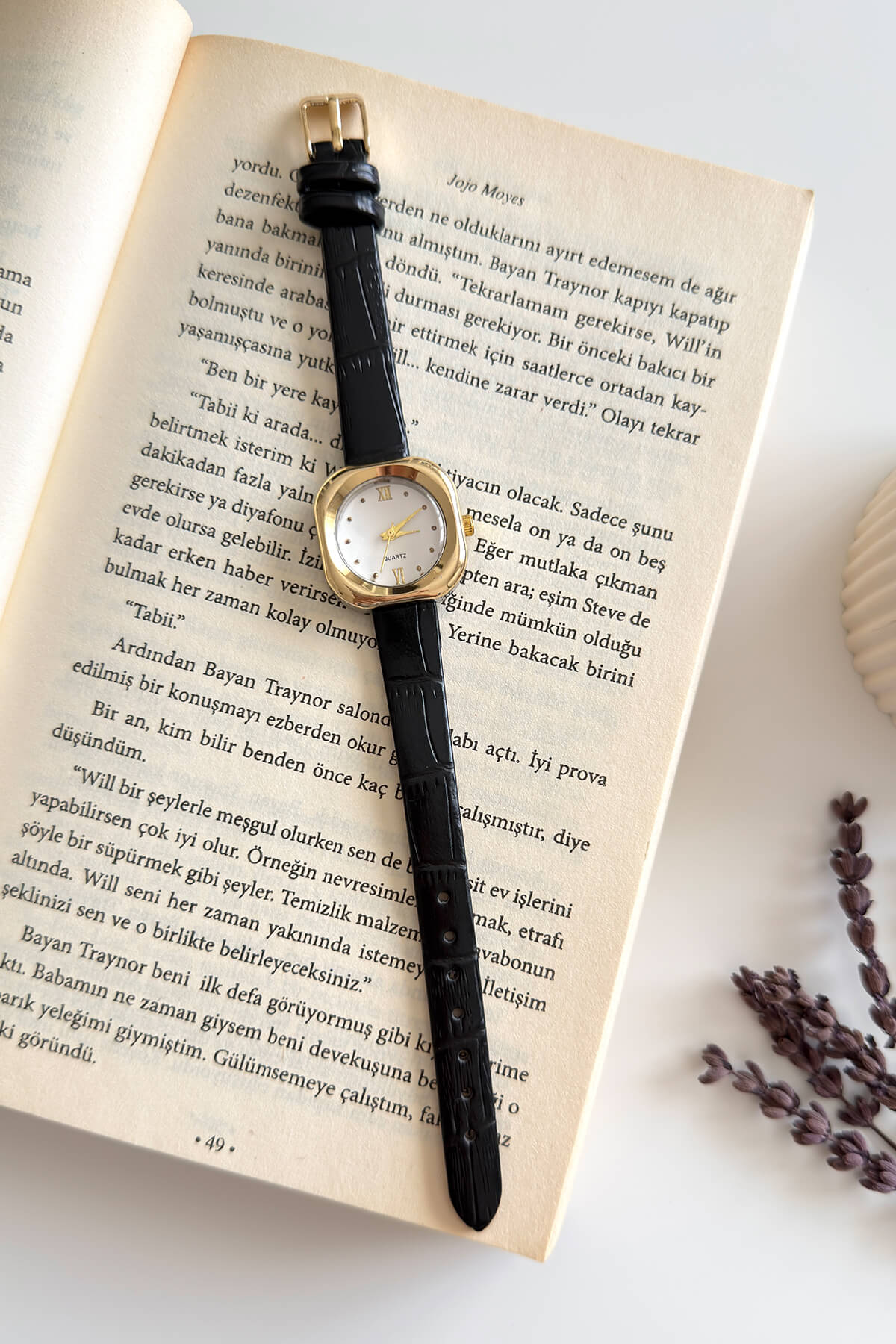Yumuşatılmış kare kasa formuyla modern ve vintage estetiği harmanlayan bu model, stilinde özgün detaylar arayan kadınlar için tasarlandı. Zarif deri kordonu ve kadranındaki minimal taşlı indeksleri, Roma rakamlı detaylarla birleşerek klasik bir zarafet sunuyor. Her türlü kıyafet kombinine sofistike bir dokunuş katan bu aksesuar, hem günlük kullanımda hem de özel anlarınızda bileğinizde zarif ve lüks bir duruş sergiler.