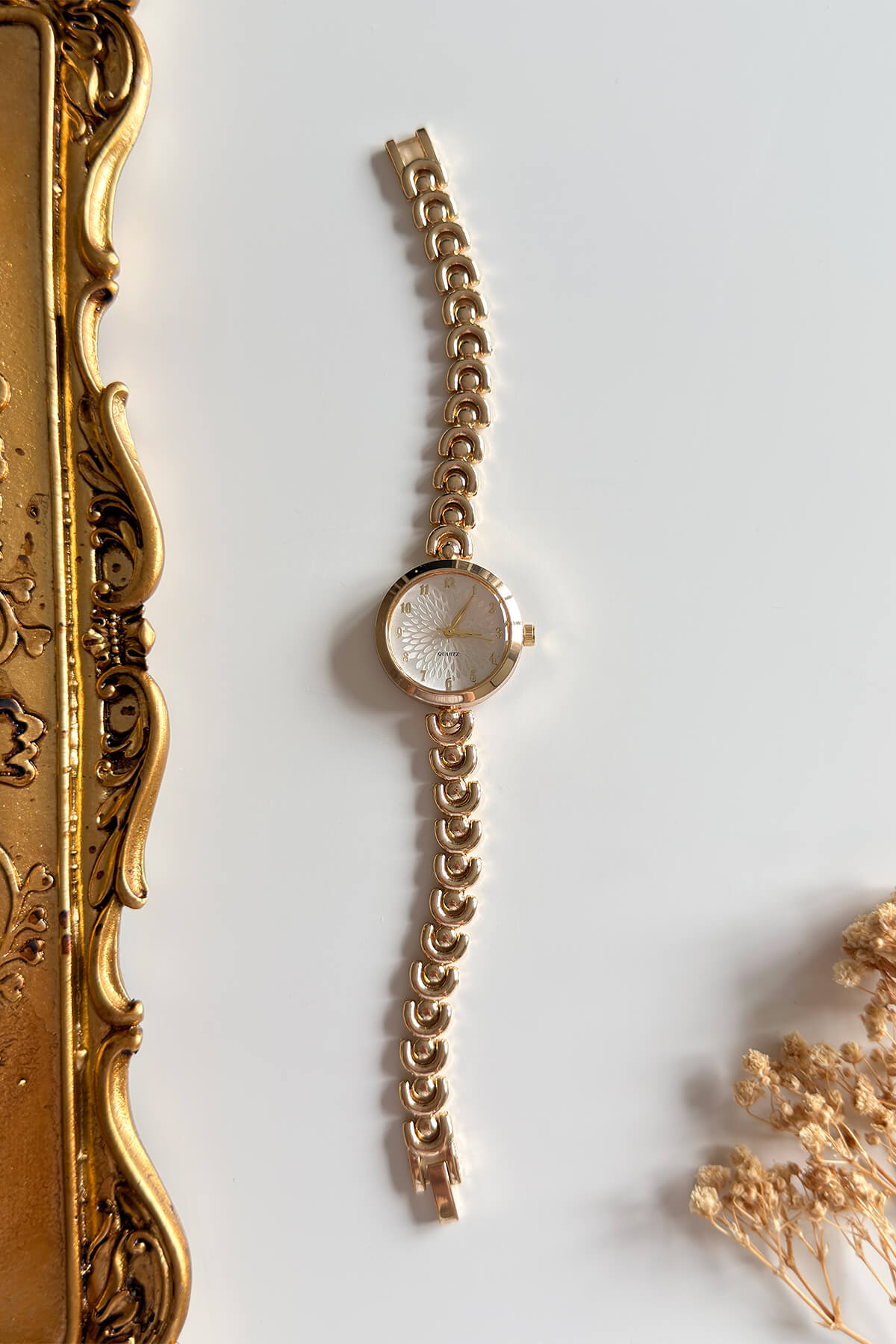 Zamanın en zarif halini bileğinizde taşıyın. Klasik yuvarlak kasa tasarımını, merkezden yayılan özel çiçek/yaprak dokulu kadranıyla birleştiren bu seri, sofistike bir şıklık arayanlar için tasarlandı. Özel tasarım birbirine geçmeli kordon yapısı, saate modern bir mücevher havası katarken bileği nazikçe sararak konforlu bir kullanım sunuyor.