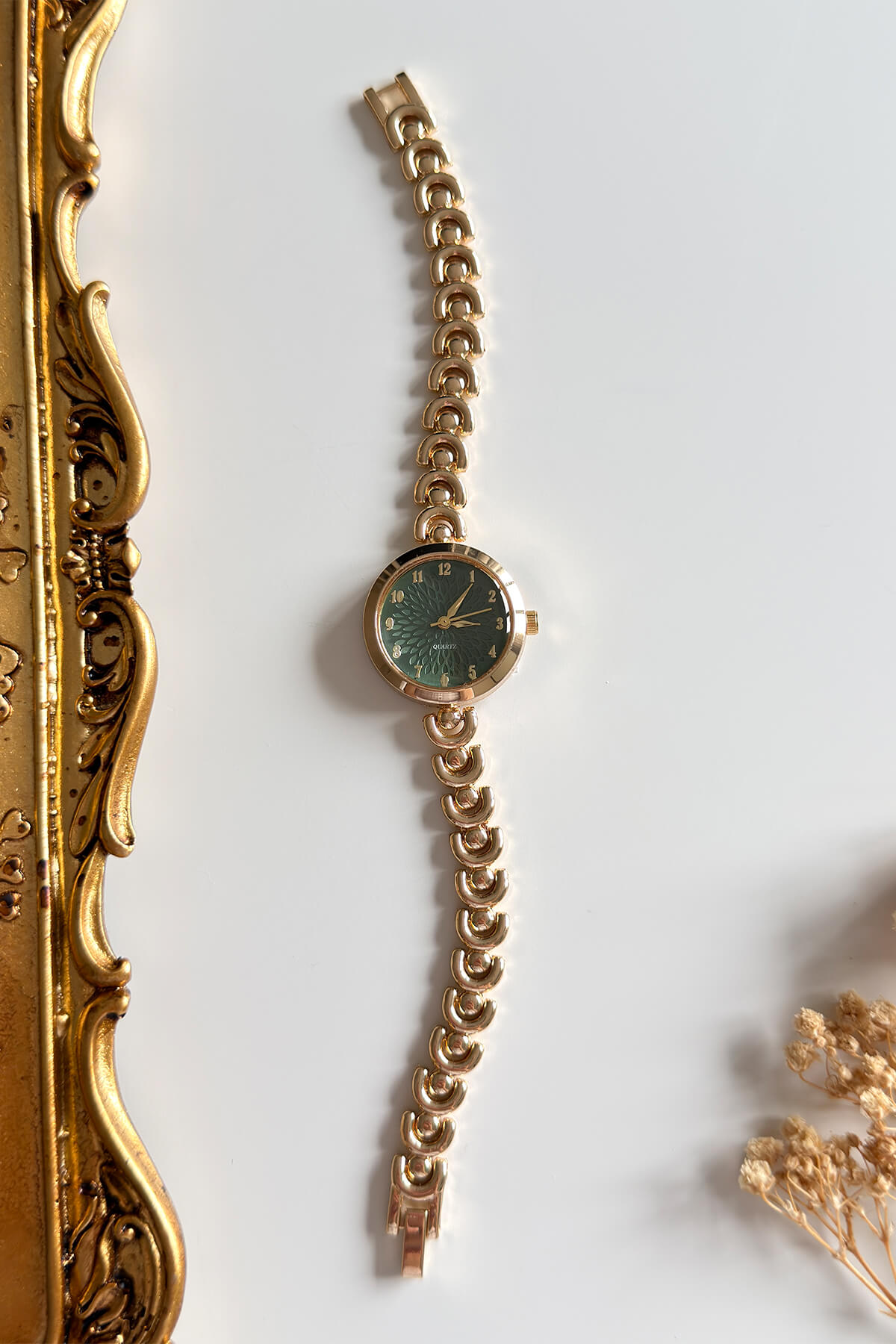 Zamanın en zarif halini bileğinizde taşıyın. Klasik yuvarlak kasa tasarımını, merkezden yayılan özel çiçek/yaprak dokulu kadranıyla birleştiren bu seri, sofistike bir şıklık arayanlar için tasarlandı. Özel tasarım birbirine geçmeli kordon yapısı, saate modern bir mücevher havası katarken bileği nazikçe sararak konforlu bir kullanım sunuyor.